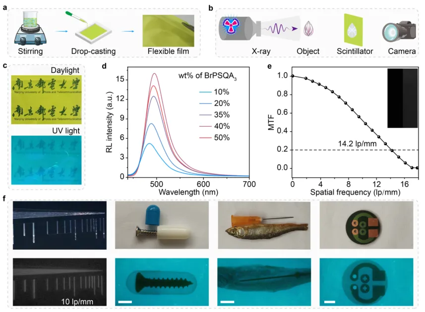 大家好,今天为大家分享来自南京邮电大学陶冶教授团队、李卫教授团队、黄维院士团队近期在 Chemistry of Materials 上发表的研究论文高效、柔性且可溶液加工的有机聚合物闪烁体在多种应用场景中需求迫切。然而,传统有机闪烁体在激子利用效率和 X 射线吸收能力方面存在固有局限。本文提出一种高性能聚合物闪烁体的设计策略:通过简便的自由基共聚反应,将多共振热活化延迟荧光发光团共价键合至溴官能化的共聚物基质中。得益于溴元素的引入,所得共聚物闪烁体通过高效的反向系间窜越过程增强了激子利用率,并显著提升了 X 射线吸收能力。优化后的材料在 500 nm 处呈现明亮的辐射发光,其半峰全宽窄至 46 nm。通过标准线对测试卡测定,该闪烁体实现了 10 lp/mm 的高空间分辨率,且检测限低至 301 nGy/s。实际 X 射线成像应用证实,该材料能够清晰分辨精细的内部结构,验证了其在临床医学与工业检测领域的应用潜力。本工作为开发先进有机闪烁体提供了一种通用的分子设计策略。