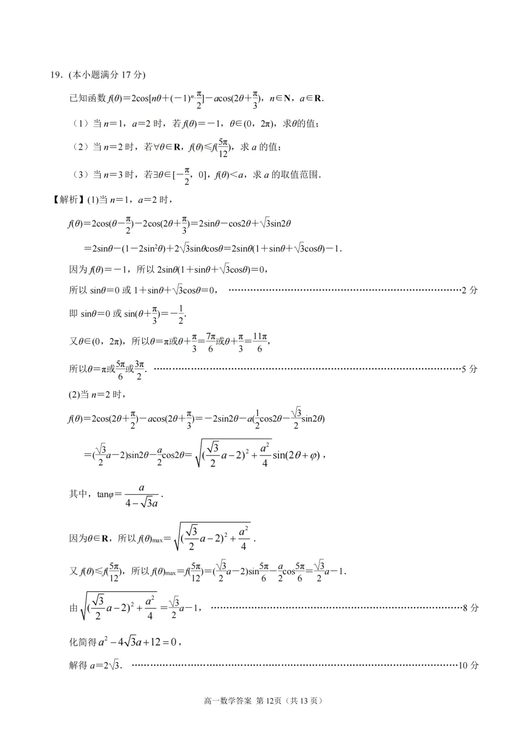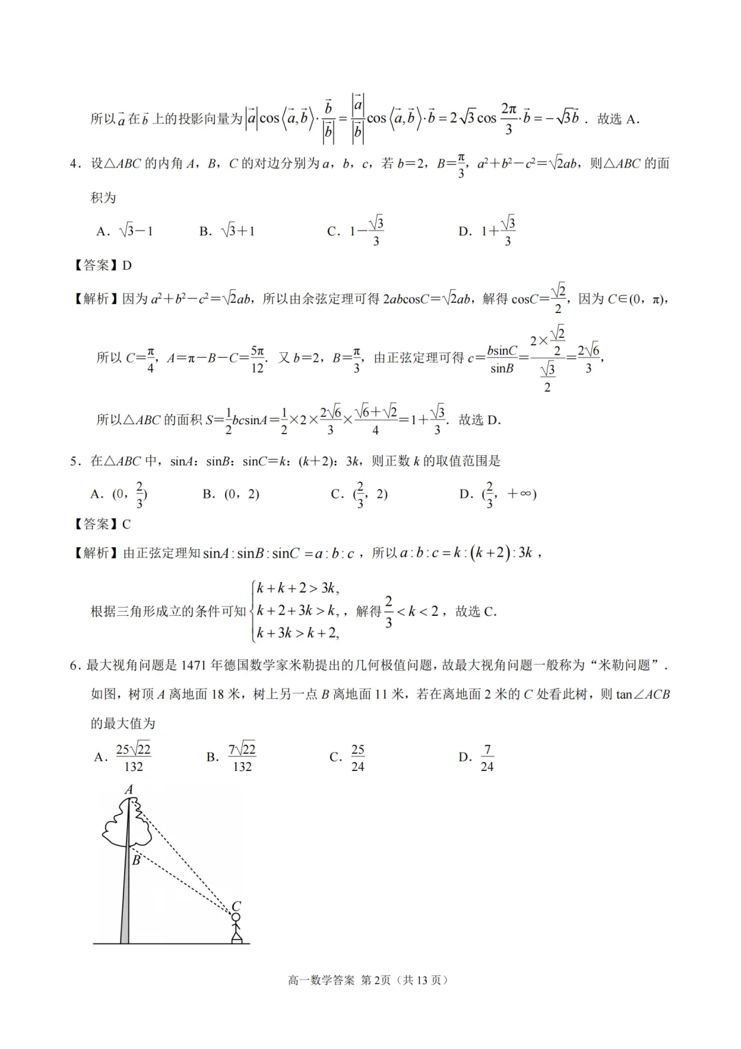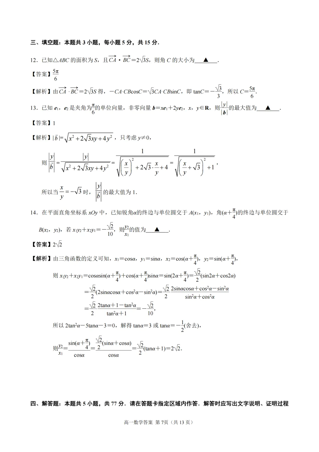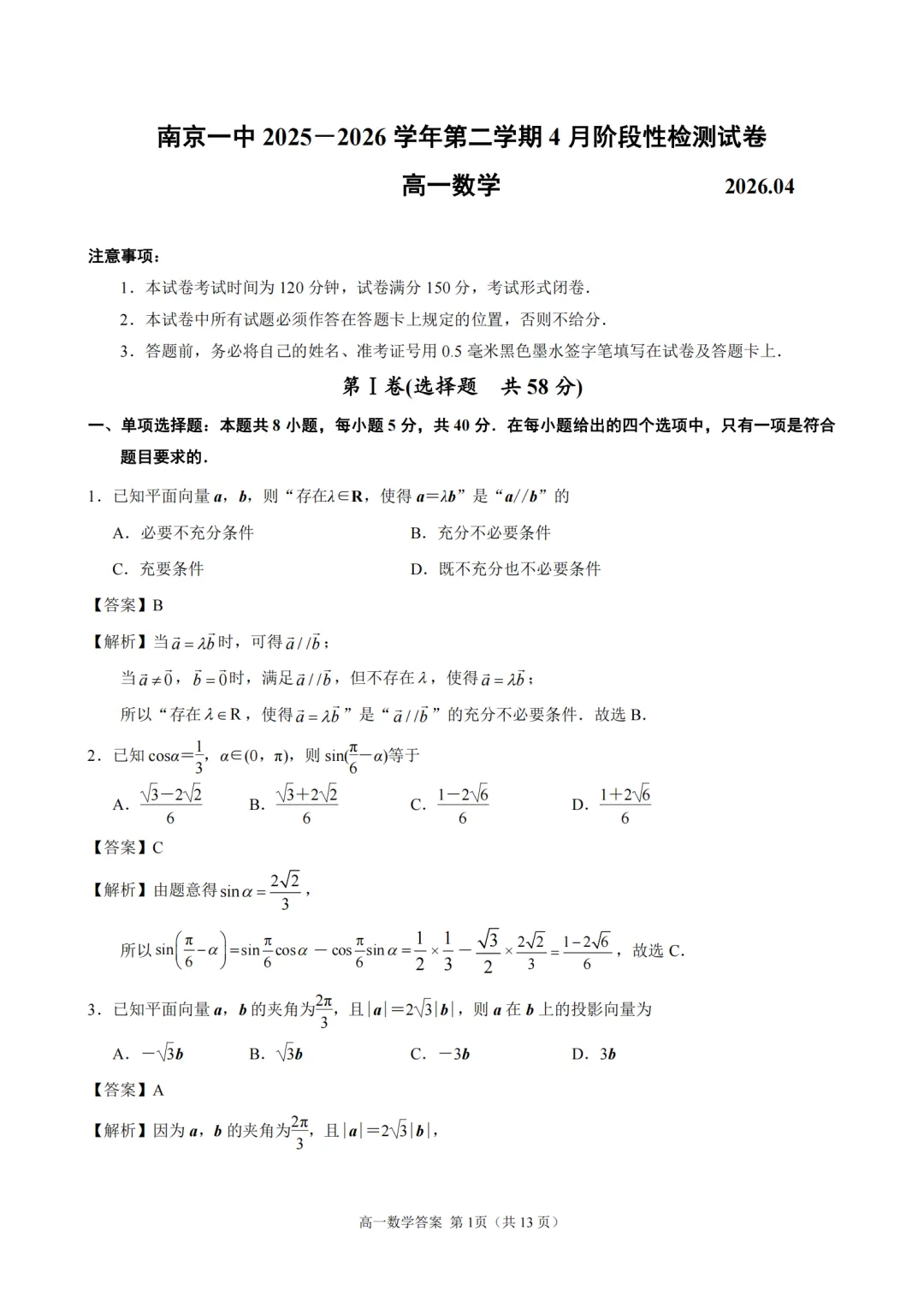 2025-2026【南京一中】高一下4月考数学及评分标准