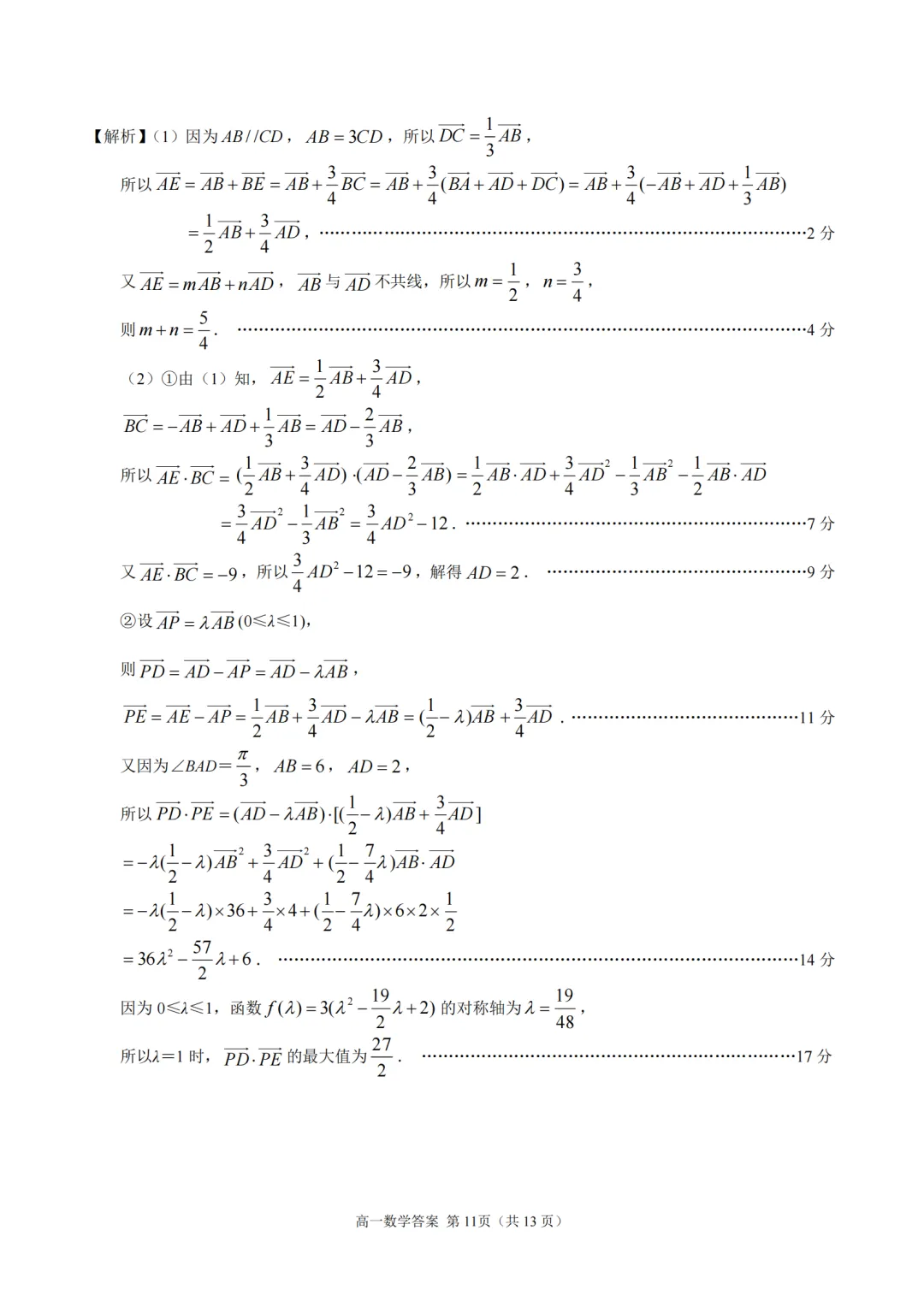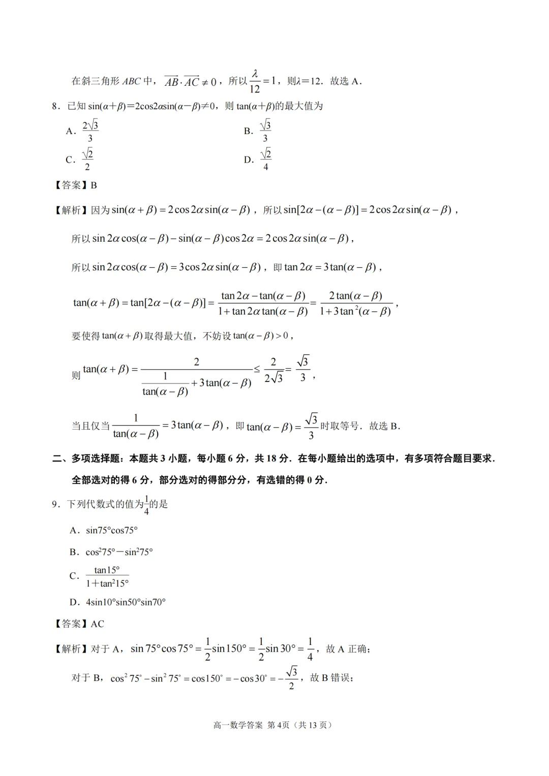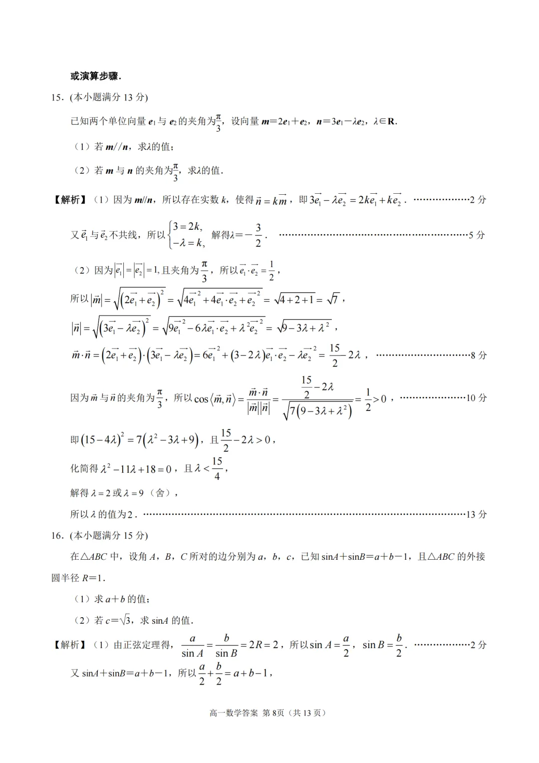 2025-2026【南京一中】高一下4月考数学及评分标准