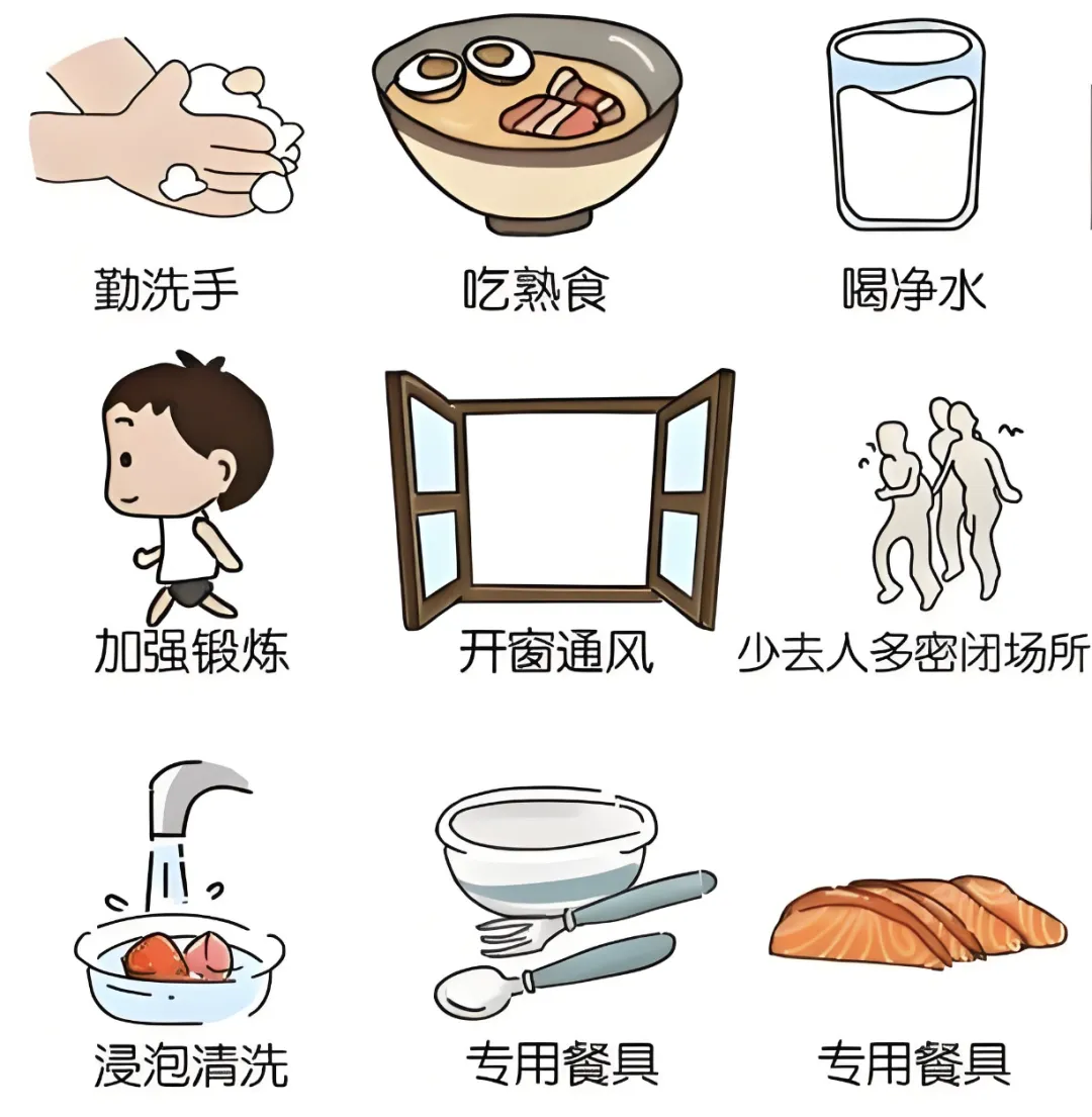 督促孩子养成勤洗手、洗对手的习惯,饭前便后、外出回家、接触玩具宠物后,务必用七步洗手法,用肥皂或洗手液流动水洗手。每天开窗通风,保持室内空气流通,定期对孩子的玩具、餐具、水杯、毛巾、衣物等进行清洗消毒,餐具可煮沸消毒15-20分钟,玩具用消毒液擦拭后清水冲净,晾晒杀菌。孩子的衣物、被褥勤洗勤晒,家长接触孩子前也要做好自身清洁,避免将外界细菌带给孩子;如发现家人有肠道传染病症状,请避免孩子与患者接触。