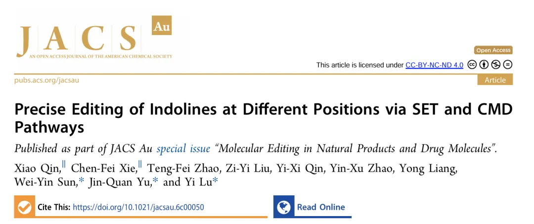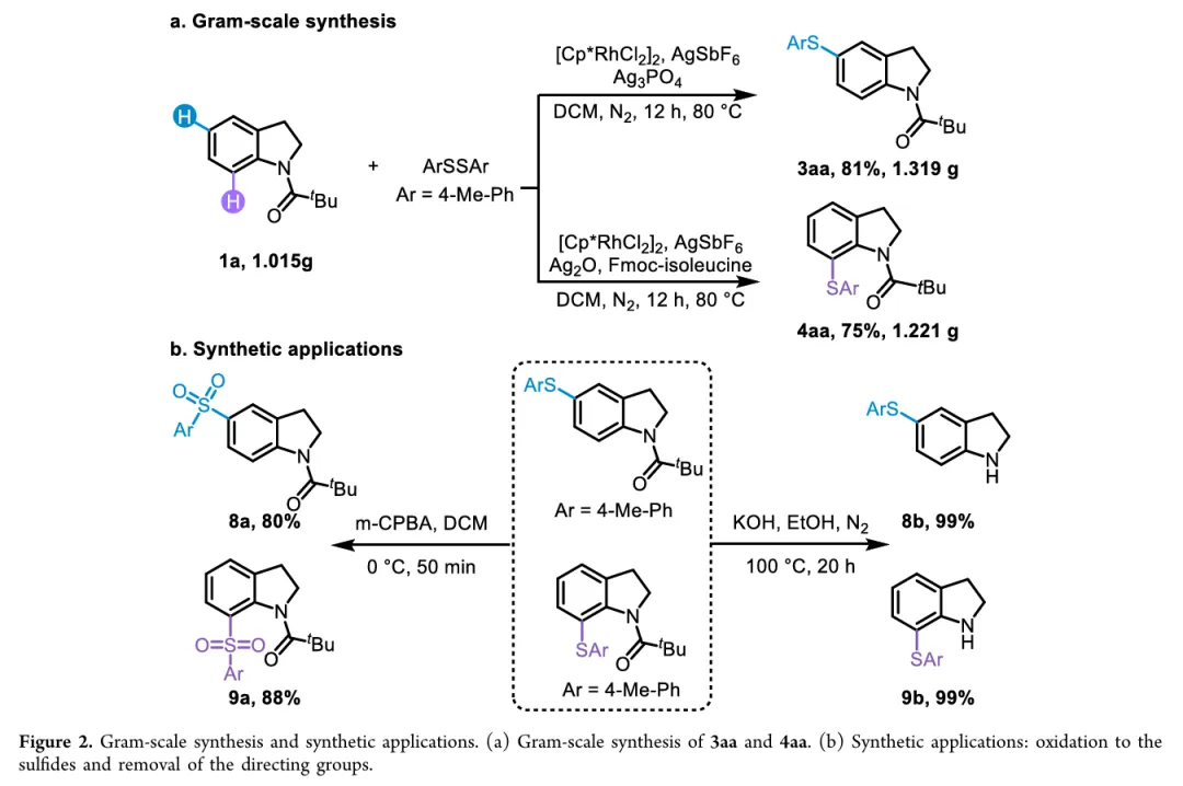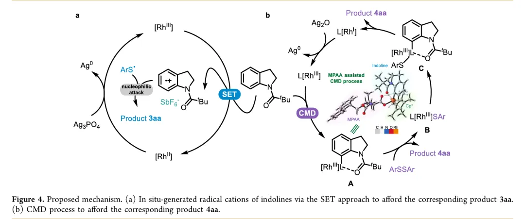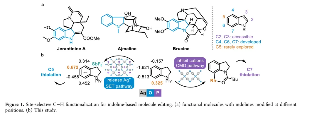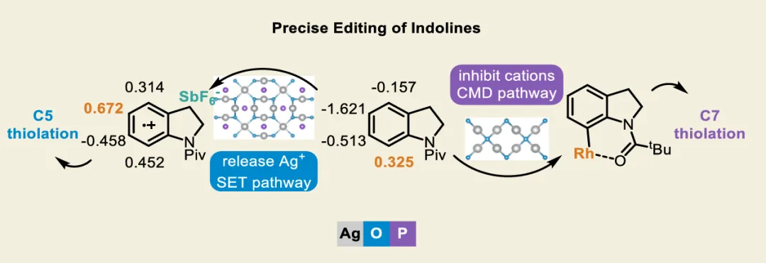 In drug discovery, the pursuit of concise and specific synthetic methods is driving the development of new strategies. Particularly during the latestages of a synthetic sequence, when the substrate molecule contains multiple highly similar C−H bonds, the ability to achieve selective “molecular editing” using mild and precise transformations has become a crucial capability. Here, we report Rh-catalyzed molecular editing of indoline derivatives at different positions via a single, oxidant-tunable catalytic system. Using Ag3PO4 as the oxidant, Rh promotes the formation of indoline radical cations stabilized by SbF6−, enabling remote C5-thiolation via a single-electron transfer (SET) mechanism, as supported by the Fukui function. In contrast, Ag2O suppresses the SET pathway, as confirmed by the ABTS assay, and enables C7-selective thiolation through a concerted metalation−deprotonation (CMD) process mediated by a Rh(III)/MPAA ligand system. Mechanistic experiments and Fukui indices calculation elucidate the origin of the observed regiodivergence, highlighting the dual reactivity of Rh(III) and offering new conceptual insights into oxidant-controlled C−H functionalization.图2. 研究背景及本策略 (图片来源于JACS Au)图3. 吲哚啉的位点选择性硫化反应条件优化 (图片来源于JACS Au)图4. 通过自由基途径实现吲哚啉C5硫化反应底物范围 (图片来源于JACS Au)图5. 通过CMD途径实现吲哚啉C7硫化反应底物范围 (图片来源于JACS Au)图6. 通过两种途径实现含不同导向基的吲哚啉硫化反应 (图片来源于JACS Au)图7. 克级合成和合成应用 (图片来源于JACS Au)图9. 可能的反应机理 (图片来源于JACS Au)In summary, we have discovered a pathway-controlled Rh(III) catalyzed C5-/C7-selective inert C−H thiolation for indoline editing. The Rh(III) catalyst exhibits dual reactivity by enabling site-selective C−H functionalization via distinct mechanistic pathways. Comprehensive mechanism investigations have elucidated the underlying principles governing each pathway, thereby offering a cohesive rationale that builds upon previous studies of C−H thiolation chemistry. This work not only advances the understanding of regioselective C−H functionalization but also provides valuable insights for designing future strategies in remote site-selective thiolation. Furthermore, both C5 and C7 thiolation reactions exhibit broad functional group tolerance and maintain a high efficiency on a gram scale, highlighting their potential applicability in industrial synthesis.