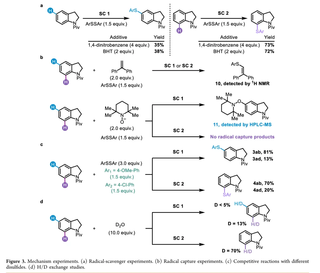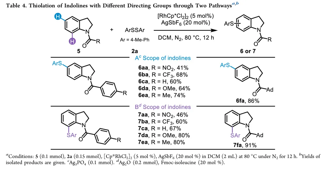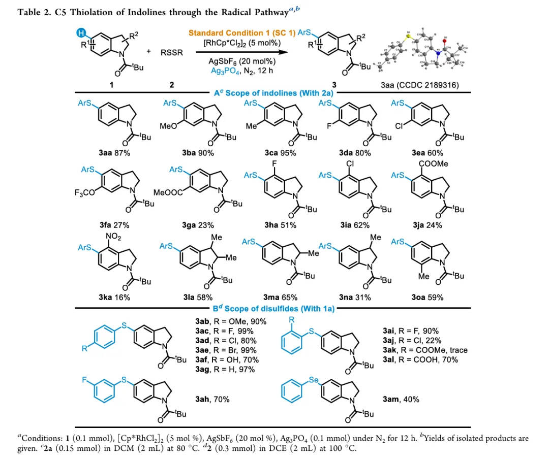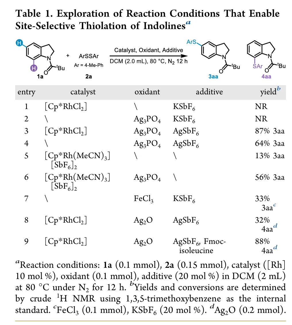 In drug discovery, the pursuit of concise and specific synthetic methods is driving the development of new strategies. Particularly during the latestages of a synthetic sequence, when the substrate molecule contains multiple highly similar C−H bonds, the ability to achieve selective “molecular editing” using mild and precise transformations has become a crucial capability. Here, we report Rh-catalyzed molecular editing of indoline derivatives at different positions via a single, oxidant-tunable catalytic system. Using Ag3PO4 as the oxidant, Rh promotes the formation of indoline radical cations stabilized by SbF6−, enabling remote C5-thiolation via a single-electron transfer (SET) mechanism, as supported by the Fukui function. In contrast, Ag2O suppresses the SET pathway, as confirmed by the ABTS assay, and enables C7-selective thiolation through a concerted metalation−deprotonation (CMD) process mediated by a Rh(III)/MPAA ligand system. Mechanistic experiments and Fukui indices calculation elucidate the origin of the observed regiodivergence, highlighting the dual reactivity of Rh(III) and offering new conceptual insights into oxidant-controlled C−H functionalization.图2. 研究背景及本策略 (图片来源于JACS Au)图3. 吲哚啉的位点选择性硫化反应条件优化 (图片来源于JACS Au)图4. 通过自由基途径实现吲哚啉C5硫化反应底物范围 (图片来源于JACS Au)图5. 通过CMD途径实现吲哚啉C7硫化反应底物范围 (图片来源于JACS Au)图6. 通过两种途径实现含不同导向基的吲哚啉硫化反应 (图片来源于JACS Au)图7. 克级合成和合成应用 (图片来源于JACS Au)图9. 可能的反应机理 (图片来源于JACS Au)In summary, we have discovered a pathway-controlled Rh(III) catalyzed C5-/C7-selective inert C−H thiolation for indoline editing. The Rh(III) catalyst exhibits dual reactivity by enabling site-selective C−H functionalization via distinct mechanistic pathways. Comprehensive mechanism investigations have elucidated the underlying principles governing each pathway, thereby offering a cohesive rationale that builds upon previous studies of C−H thiolation chemistry. This work not only advances the understanding of regioselective C−H functionalization but also provides valuable insights for designing future strategies in remote site-selective thiolation. Furthermore, both C5 and C7 thiolation reactions exhibit broad functional group tolerance and maintain a high efficiency on a gram scale, highlighting their potential applicability in industrial synthesis.