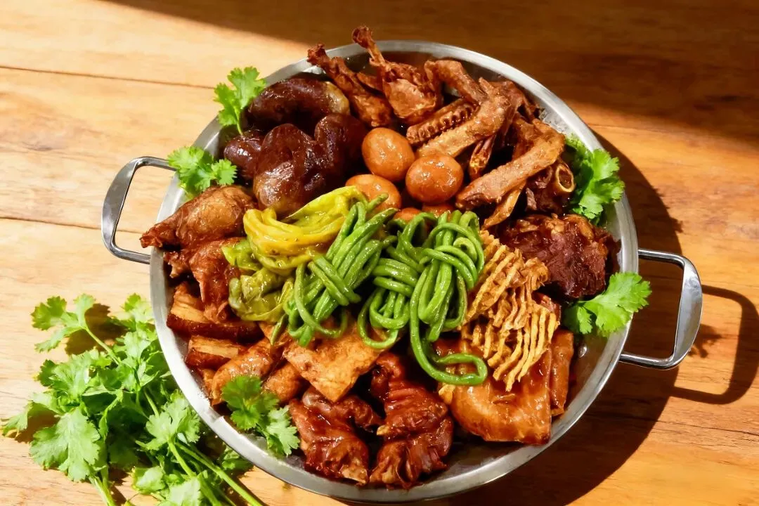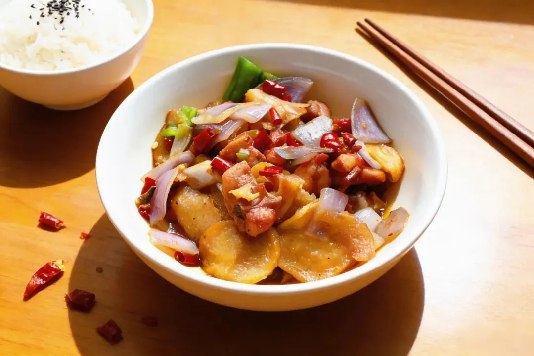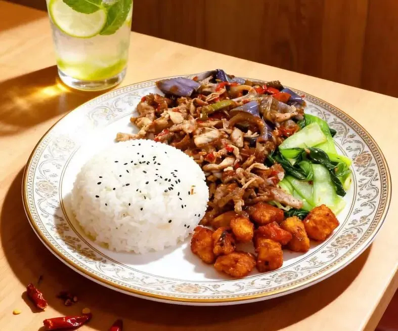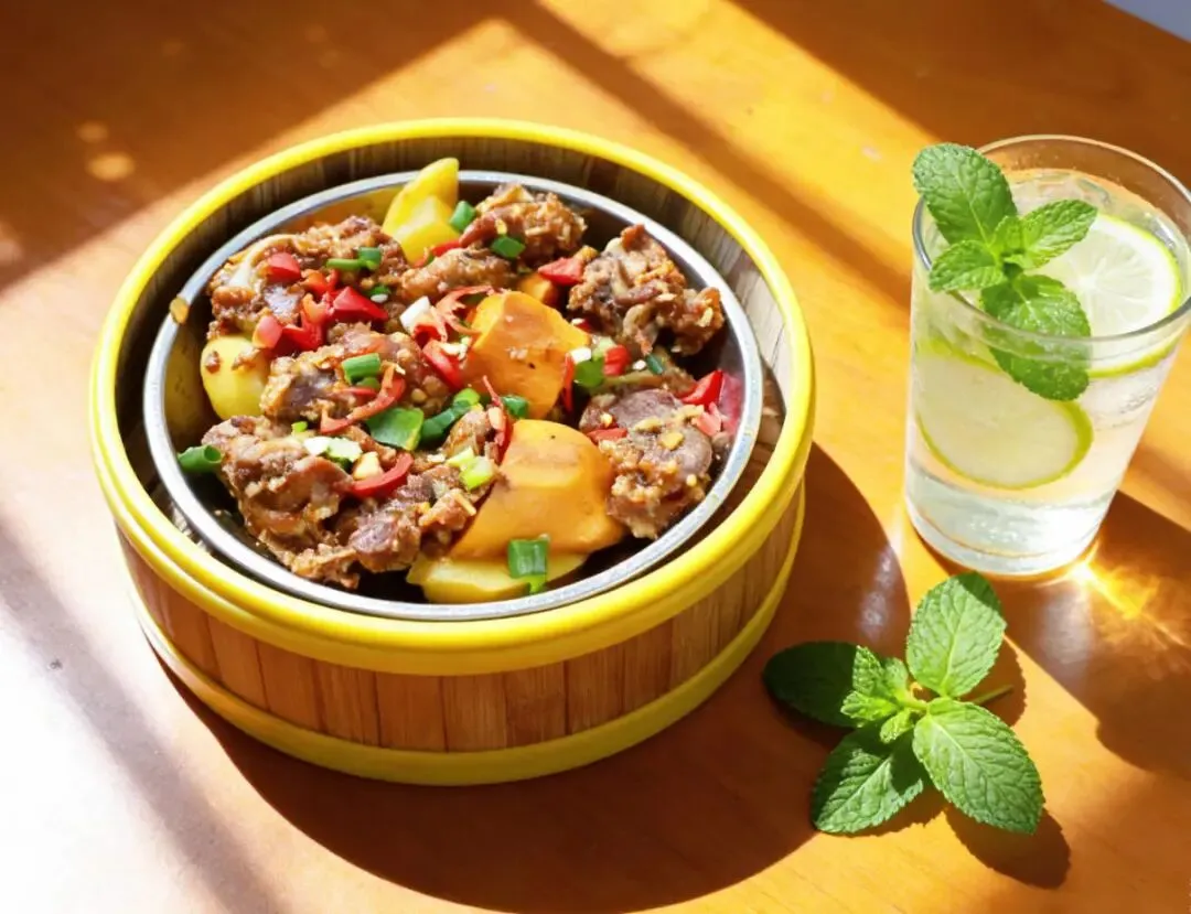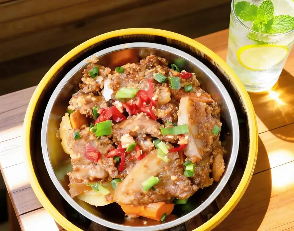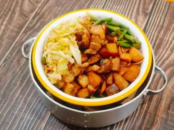 这一份是“碳水+碳水”的快乐!面条是蒸出来的,口感劲道,吸饱了红烧肉的酱汁。豆角和土豆炖得软糯,红烧肉肥瘦相间,拌在一起吃,绝了!