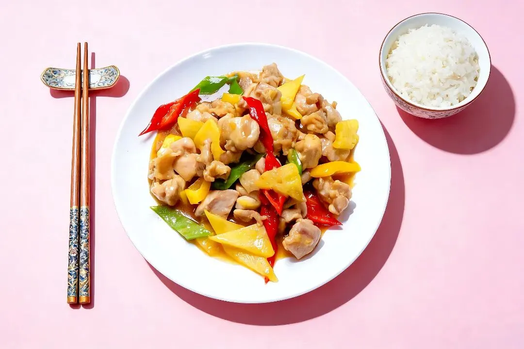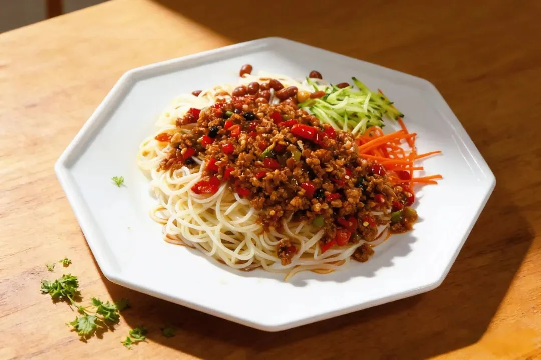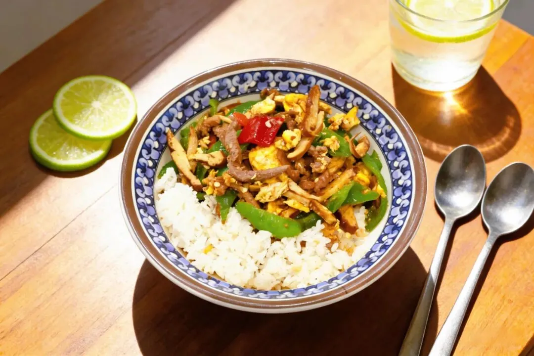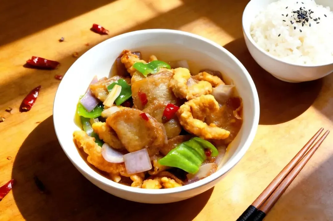 一整块大排铺在炒面上,肉质厚实,酱香浓郁。面条是粗面,炒得锅气十足,每一根都裹满了酱汁。