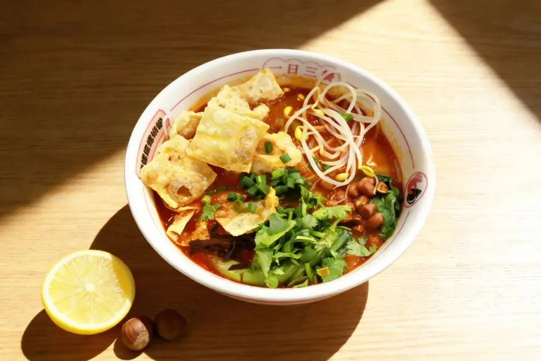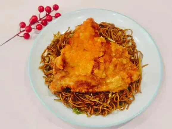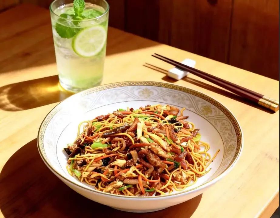 虾仁、鱿鱼、肉片三鲜齐聚,搭配爽脆的青菜。面条炒得干香不油腻,清淡味鲜。