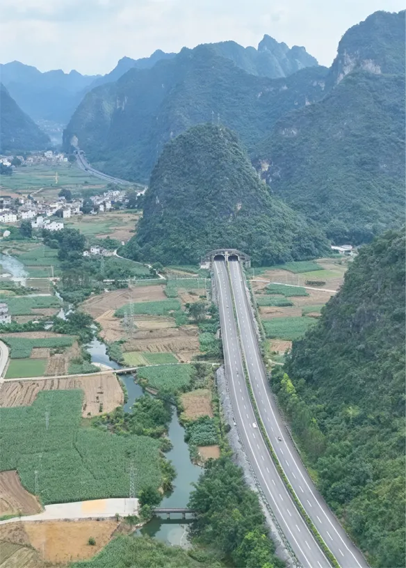 广西河都高速公路全线穿越喀斯特地貌山区。下图为该高速公路某段景观图和遥感影像图。据此完成下面小题。