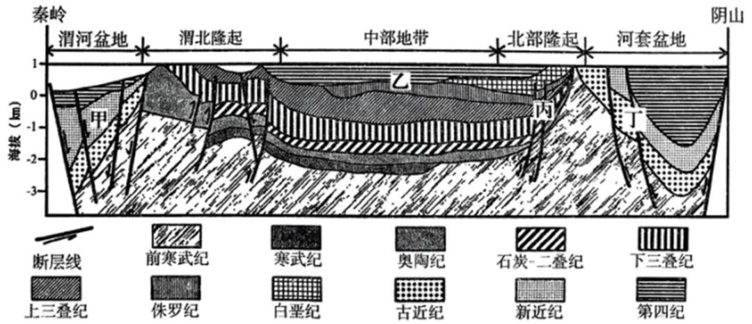 陕甘宁及内蒙古地区天然气资源丰富,集中形成于古生代。下图为该区域南北向地质剖面图。据此完成下面小题。
