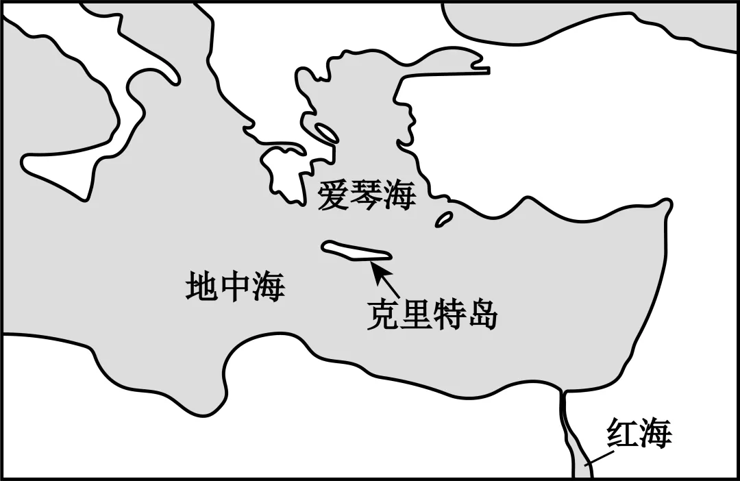 克里特岛是希腊著名的旅游胜地。公元前20世纪至公元前15世纪,这里的米诺斯文明兴盛,手工业发达,商贸活动频繁,后来该文明迅速衰落。下图为克里特岛地理位置示意图。据此完成下面小题。