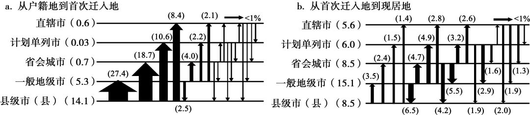 下图示意截至2017年中国流动人口多次迁移格局,其中箭头宽度与迁移数量呈正相关,不同行政等级城市旁的括号内数字为同级迁移占比。据此完成下面小题。