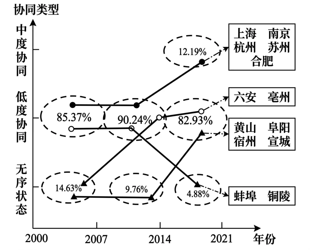 协同是推进城市经济系统有序发展的重要路径。下图为2000—2021年长三角地区城市经济协同类型演变模式图(百分比为某类协同的城市数量占区域城市总数量的比重,折线与箭头代表不同的演变过程及对应城市)。据此完成下面小题。