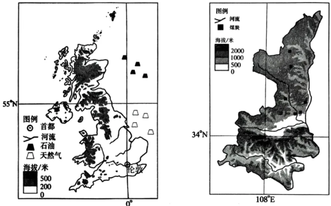 材料一英国与我国陕西省面积相当、轮廓相似,都属于能源资源富集区。下图为“英国与我国陕西省的区位示意图”。
