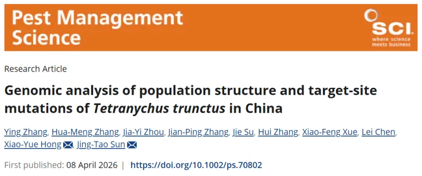 “Genomic analysis of population structure and target-site mutations of Tetranychus trunctus in China”文章发表在《Pest Management Science》。截形叶螨种群遗传结构受地理隔离与人类活动共同塑造,其抗药性演化与种群历史紧密关联;中国东南地区种群遗传分化显著、多样性低,独立演化出F331Y抗药突变,北方种群因人为基因流广泛扩散单一起源的F331W与G328A突变,需实施区域差异化防控策略。