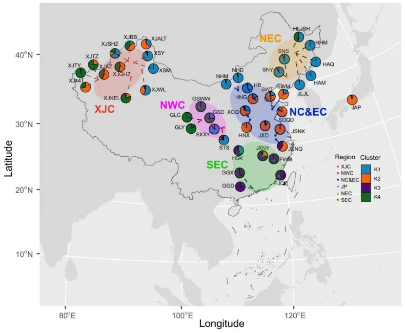 种群遗传结构:划分为4个地理支系,东南支系分化最高、核苷酸多样性最低;北方及新疆种群存在广泛基因交流,地理聚类存在偏差,人类活动介导长距离扩散是主要原因。