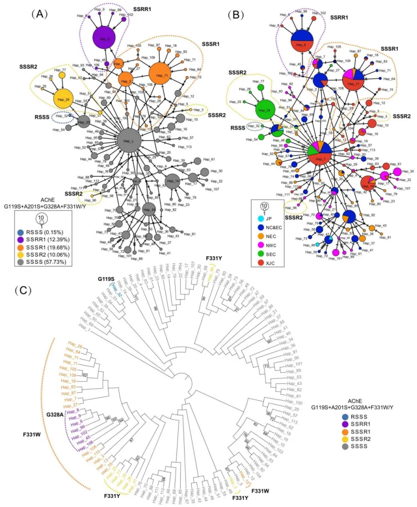 突变演化:F331W与G328A为单一起源,在北方广泛扩散;F331Y为多次独立起源,主导东南支系抗药性。