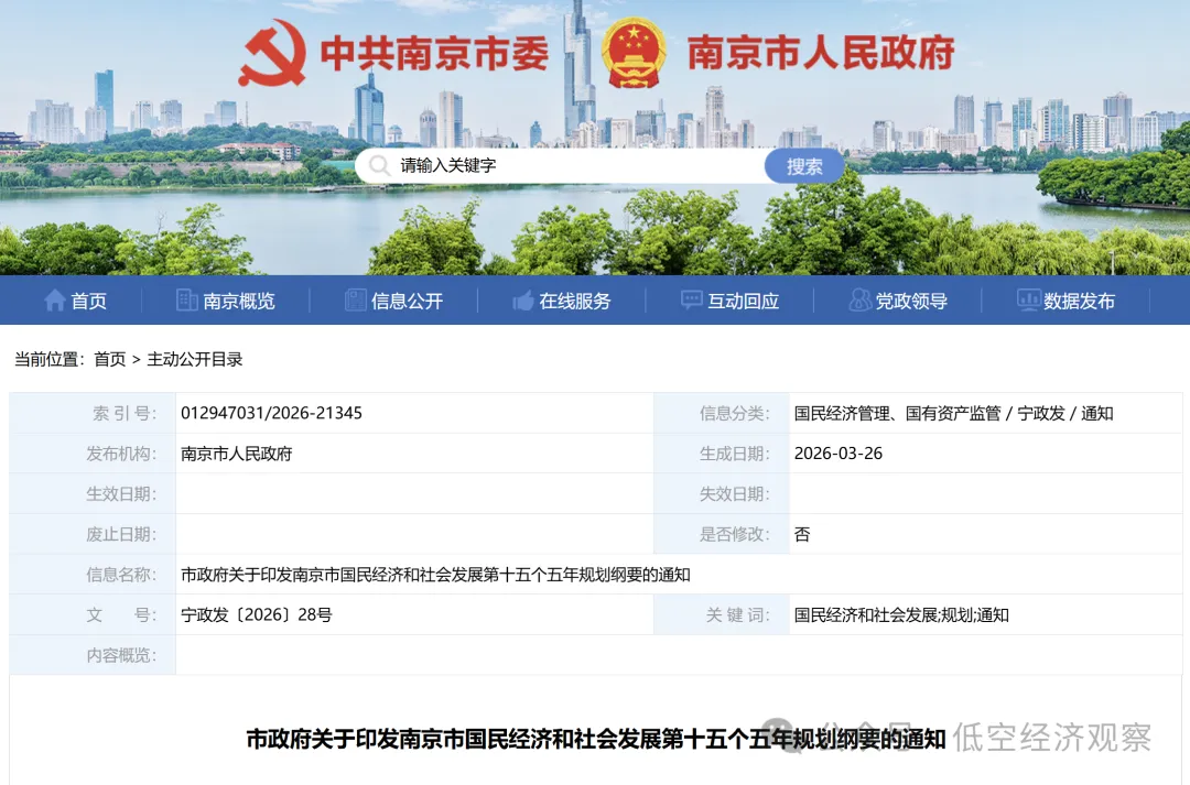 【低空经济动态】南京:“十五五”末,低空经济(航空航天)产业规模超1000亿元