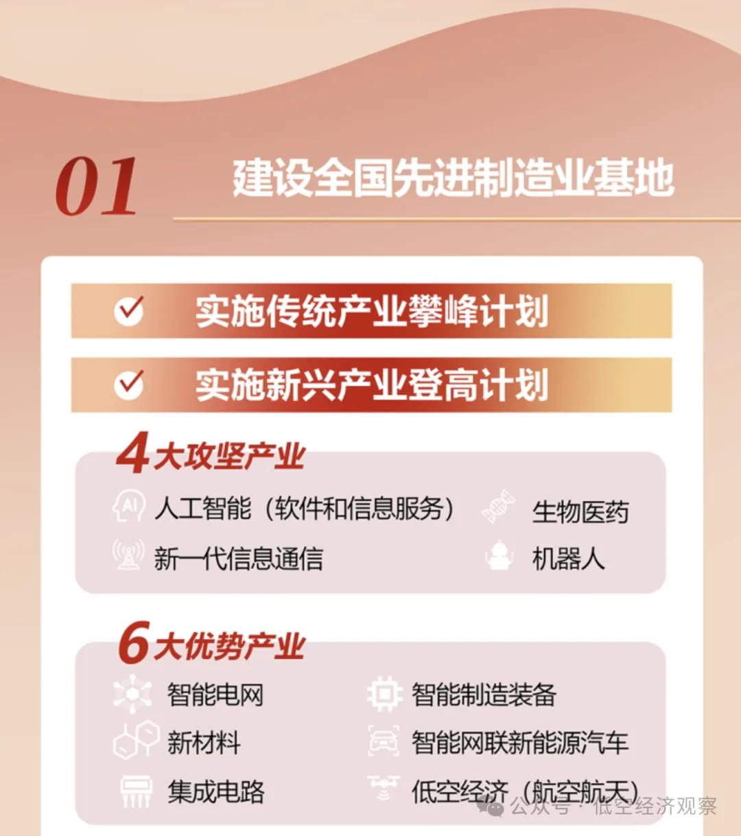 聚焦人工智能(软件和信息服务)、生物医药、新一代信息通信、机器人等四大攻坚产业,智能电网、智能制造装备、新材料、智能网联新能源汽车、集成电路、低空经济(航空航天)等六大优势产业,实施产业创新工程,一体推进创新设施建设、技术研究开发、产品迭代升级,发挥产业基金投资撬动作用,加快新兴产业规模化发展。