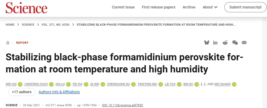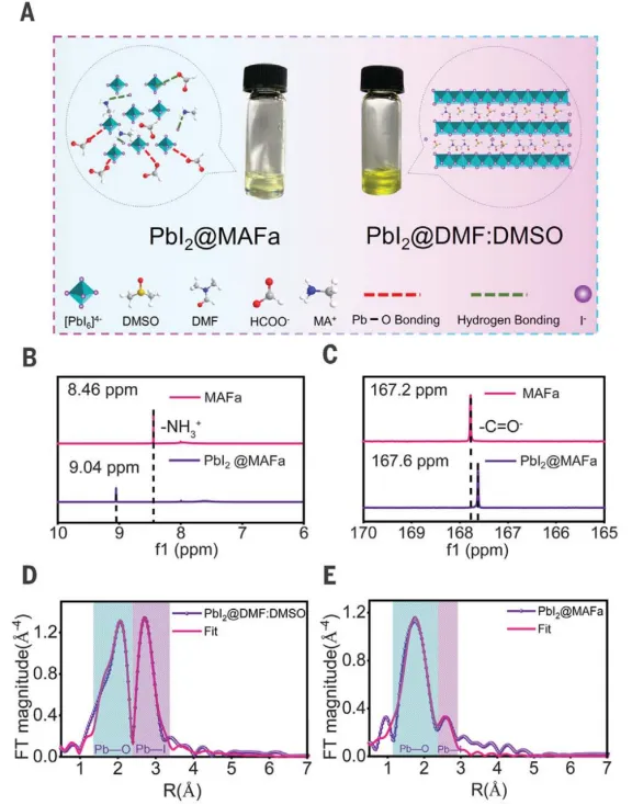 2021年,西北工业大学黄维与南京工业大学陈永华等人开发了一种基于离子液体甲胺甲酸盐(MAFa)的新型合成方法,通过生长垂直取向的碘化铅(PbI₂)薄膜,实现了在室温和高湿度(20%至90% RH)环境下稳定黑相甲脒铅碘(α-FAPbI₃)钙钛矿的制备。该垂直取向结构形成了纳米级离子通道,极大地促进了甲脒阳离子(FA⁺)的渗透并降低了相变能垒,从而获得了光电转换效率高达24.1%且具有优异长期运行稳定性的钙钛矿太阳能电池。钙钛矿太阳能电池(PSCs)因其高载流子迁移率、长扩散长度和可调带隙而受到广泛关注。其中,黑相甲脒铅碘(α-FAPbI₃)具有最窄的带隙(1.45-1.51 eV),是理想的光吸收材料。然而,α-FAPbI₃在环境条件下极易转变为宽带隙的黄色非钙钛矿相(δ-FAPbI₃),且其加工过程通常对温度和湿度极其敏感,需要在惰性气体保护下进行严格控制。这种不稳定性及严苛的加工要求限制了钙钛矿太阳能电池的大规模生产和实际应用。引入离子液体MAFa作为溶剂,利用其与PbI₂之间强大的螯合作用(C=O···Pb)和氢键(N-H···I)作用,诱导PbI₂垂直于衬底生长。垂直取向的PbI₂薄膜具有纳米级离子通道,为FA⁺离子的扩散提供了直接路径,显著降低了向黑相转变的能量障碍。实现了在极宽的湿度范围(20%-90% RH)和温度范围(25°C-100°C)内快速形成稳定的α-FAPbI₃,不再依赖严苛的实验环境。器件效率达到24.1%,且在85°C热应力或连续光照下表现出卓越的稳定性。
