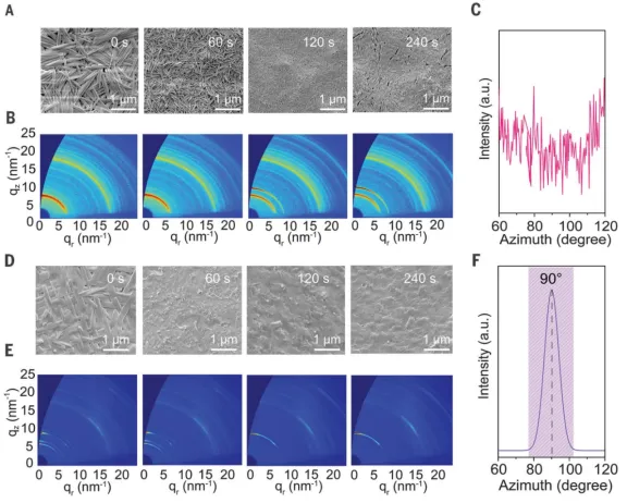 数据分析:通过核磁共振(NMR)和X射线吸收精细结构(EXAFS)分析,证实了MAFa中的C=O基团与Pb²⁺存在强烈的螯合作用,且氨基氢与I⁻形成了强氢键。这种强相互作用保护了溶液免受氧化,并为后续的垂直取向生长奠定了化学基础。图 2 (A, D) SEM形貌对比;(B, E) 原位GIWAXS谱图;(C, F) 方位角积分曲线。