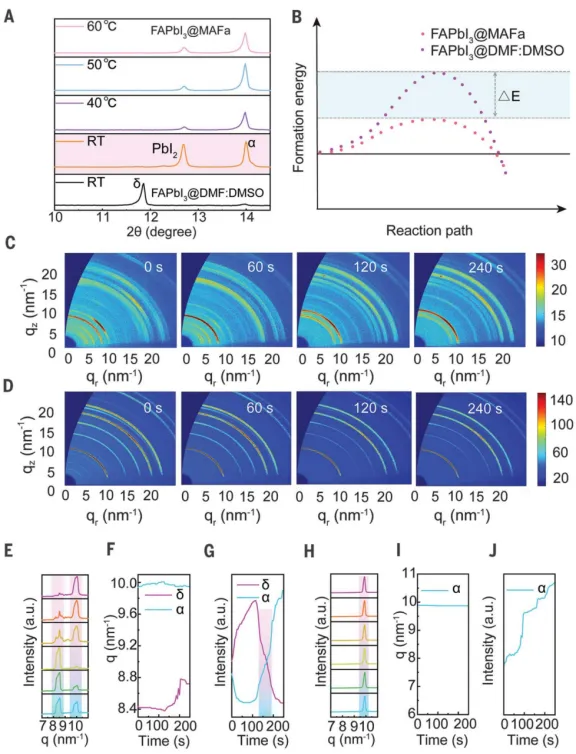 数据分析:对比发现,DMF:DMSO制备的薄膜呈针状且取向随机,容易产生针孔;而MAFa制备的PbI₂薄膜呈现出均匀的、大于1微米的大晶粒,且具有极强的垂直取向(方位角积分在90°处有尖锐峰)。这种整齐排列的畴区在MAFa挥发后形成了垂直的纳米离子通道。图 3 (A) XRD对比;(B) 结晶动力学示意图;(C-J) 结晶过程的实时GIWAXS分析。