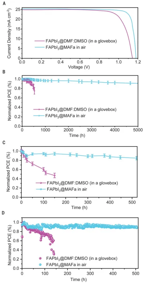 数据分析:XRD结果显示,MAFa基薄膜在室温空气中即可形成纯黑相α-FAPbI₃,完全抑制了黄相。结晶动力学模型表明,垂直取向的PbI₂结构提供的离子通道降低了FA⁺进入晶格的阻碍(ΔE降低),使得相变反应能够迅速且稳健地发生。图 4 (A) 冠军器件的J-V曲线;(B) 黑暗环境下存放稳定性;(C) 85°C连续加热热稳定性;(D) 最大功率点运行稳定性。