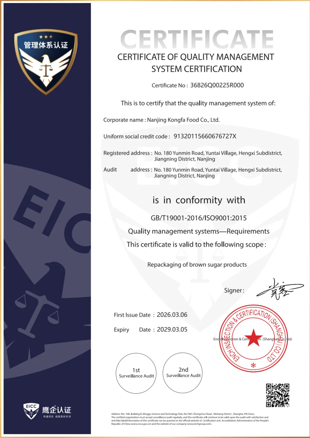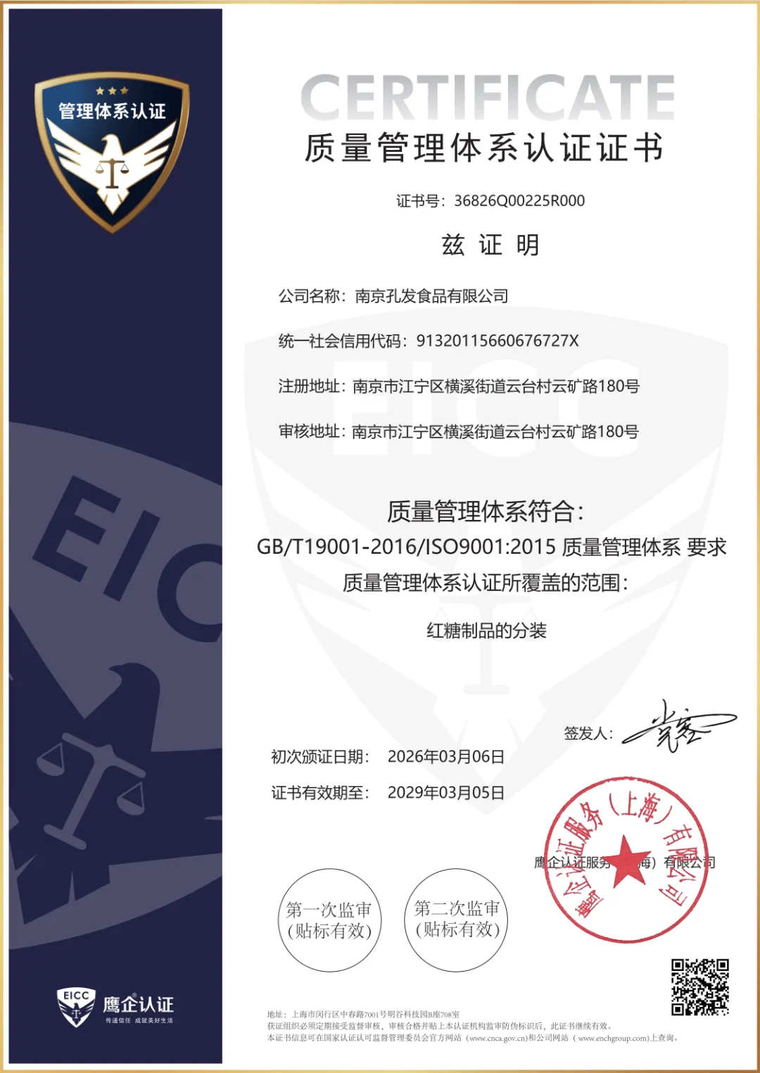 南京孔发食品有限公司,以及旗下的“尚糖坊”与“鑫五湖”品牌,将以此为新起点,持续运行并优化这套管理体系。因为我们深信,最高的标准,不应是贴在墙上的荣誉,而应是融入血液的习惯。