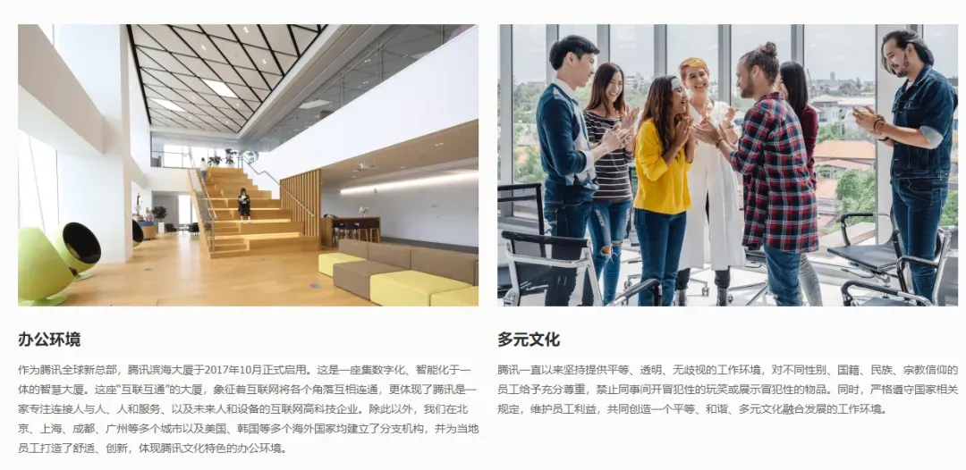 ◦ 特色福利:入职满一周年的员工可获得精美的价值观非卖品 QB 卡,还有入职十周年贺礼、结婚庆贺礼包、生育庆贺礼包等。员工还可在腾讯形象店购买周边产品,享受免费早餐和贴心宵夜,使用办公区的健身器械等。