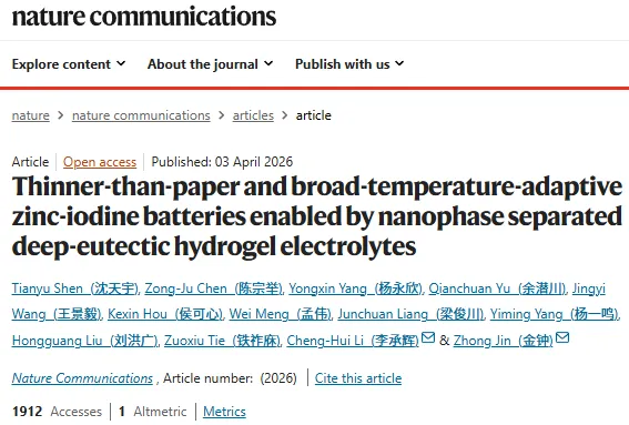 论文信息:Shen, T., Chen, ZJ., Yang, Y. et al. Thinner-than-paper and broad-temperature-adaptive zinc-iodine batteries enabled by nanophase separated deep-eutectic hydrogel electrolytes.