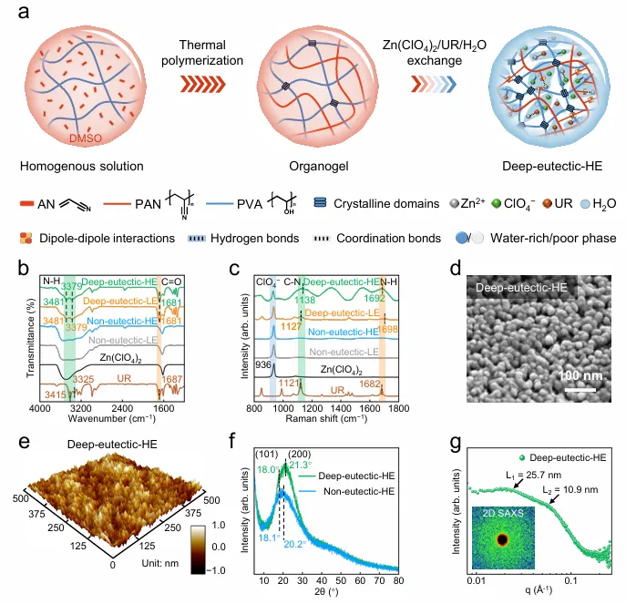 图1 | 设计、制备与表征(a)通过溶剂交换过程制备深共晶水凝胶电解质的流程图。(b-c)(b)ATR-FTIR和(c)不同电解质及对照样品的拉曼光谱。(d-g)深共晶水凝胶电解质的(d)SEM图像、(e)AFM图像、(f)XRD图谱和(g)SAXS图谱。(g)中的插图为深共晶水凝胶电解质的2D SAXS图案。