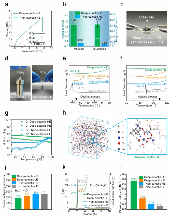UR与H₂O、ClO₄⁻之间的氢键网络将水分子“锚定”在聚合物网络中,抑制冰晶成核和高温蒸发。DSC显示,deep-eutectic-HE在-40℃以下无结晶峰,80℃以上无吸热峰(图2e-f)。水保持率在25℃/15% RH下48小时仍达88.4%。