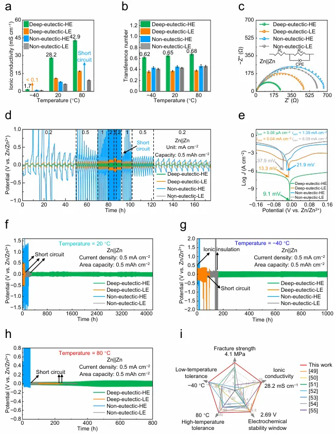 图3 | 电化学性能(a-c)不同温度下深共晶水凝胶电解质、深共晶液体电解质、非共晶水凝胶电解质和非共晶液体电解质的(a)离子电导率、(b)Zn²⁺迁移数和(c)界面阻抗。(c)中的点、线和插图为实验数据、拟合结果和等效电路。(d-h)(d)倍率性能、(e)Tafel曲线以及(f)20℃、(g)-40℃和(h)80℃下Zn||Zn对称电池的恒流循环稳定性。(i)深共晶水凝胶电解质与近期报道的其他水凝胶电解质在断裂强度、离子电导率、电化学窗口和低/高温耐受性方面的性能比较。