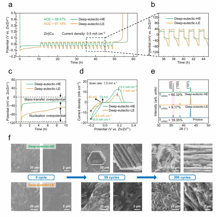 界面阻抗(图3c):Zn|deep-eutectic-HE|Zn电池界面阻抗仅238 Ω,远低于其他对照组(466-664 Ω)。