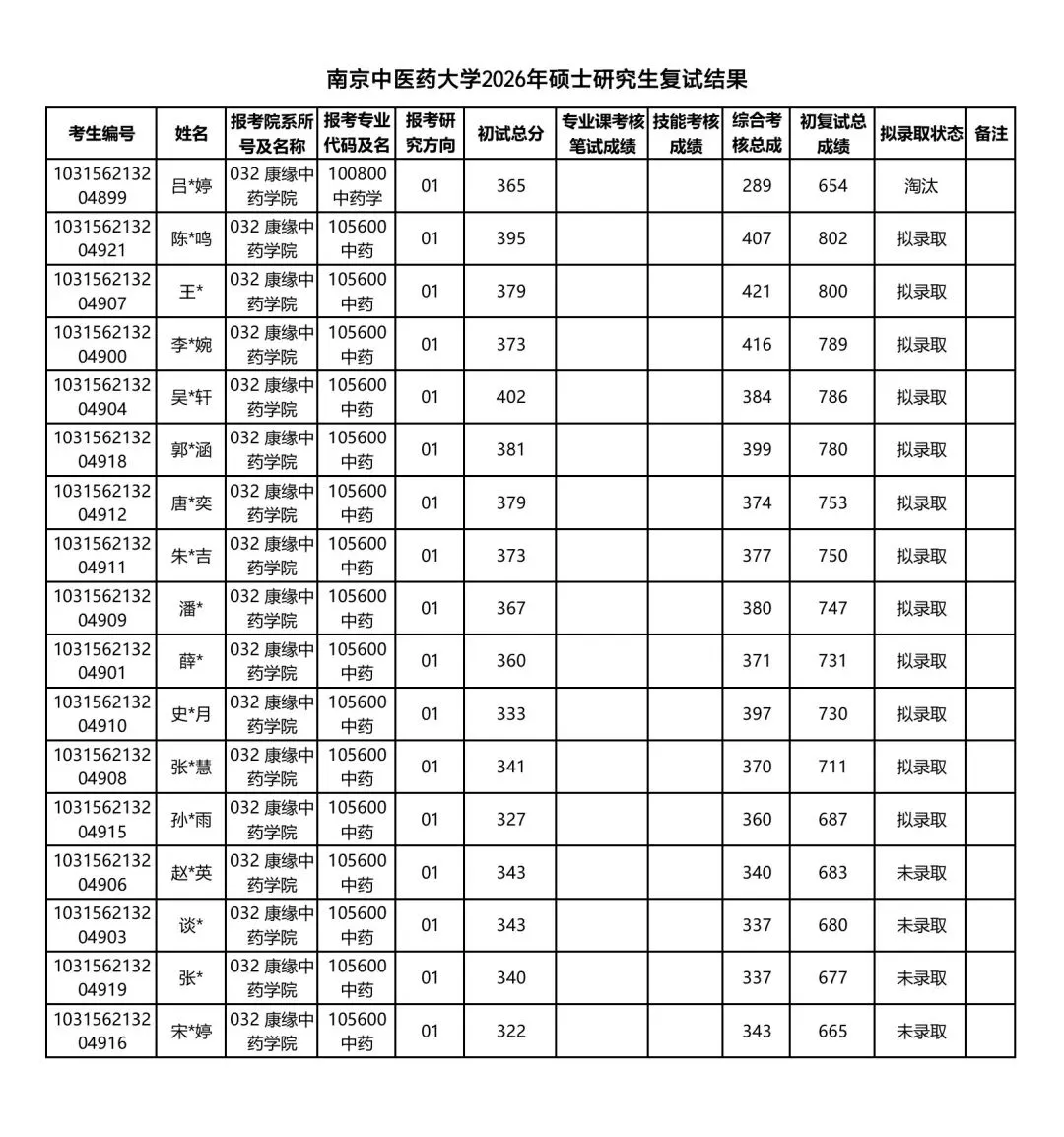 >南京中医药大学2026年康缘中药学院硕士研究生一志愿拟录取名单
