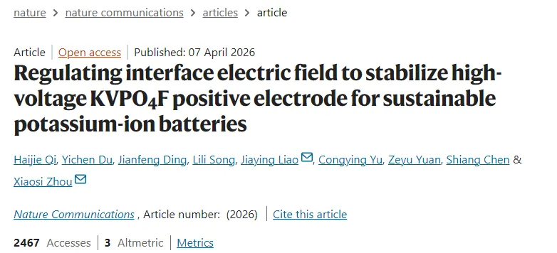 近年来,钾离子电池(PIBs)因其成本效益高、钾资源丰富以及标准电极电位适宜(-2.93 V vs. 标准氢电极)等优势,成为电网级储能的有前景候选体系。然而,K⁺较大的离子半径(1.38 Å)常导致电极材料结构坍塌,阻碍了高效PIBs的发展。在各类正极材料中,聚阴离子化合物因其稳健的三维框架和开放的离子扩散通道而备受关注。其中,氟磷酸钒钾(KVPO₄F,简称KVPF)因其高工作电压(>4 V)和理想的理论容量(131 mAh g⁻¹)而吸引了大量研究兴趣。尽管如此,KVPF仍面临两大主要挑战:一是本征电子电导率低,限制了电荷/离子传输动力学;二是高电压下电解液诱导的晶格腐蚀,引发晶体结构退化和厚而不稳定的正极电解液界面(CEI)形成,最终导致性能快速衰减。传统碳包覆策略虽能适度改善KVPF的导电性,但在提升PIBs高压稳定性方面效果有限,尤其在调控CEI组成和结构方面。相比之下,界面电场(IEF)工程为解决这一挑战提供了理想方案。前期研究表明,构建IEF可有效优化电极/电解液界面,如通过Li⁺/K⁺协同效应形成表面电场以稳定CEI层,或构建内建电场促进高熵固态电解液界面的生成。这些发现凸显了电场在界面稳定性中的关键作用,但电场强度与CEI组成之间的内在关系、最优场强的定量判定标准以及电场优化聚阴离子正极性能的机制等基础问题仍有待解决。因此,开发有效的界面电场调控策略,对于发展低成本、高能量密度的钾离子电池具有重要意义。
