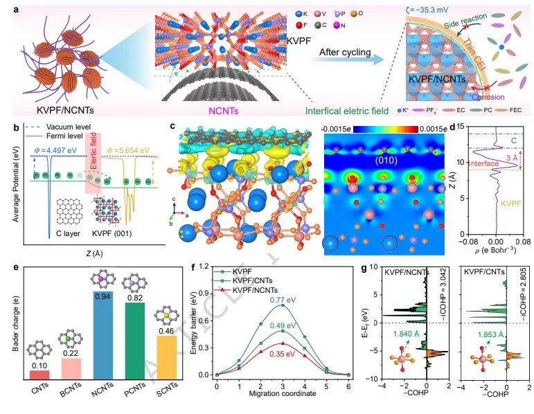 在这项研究中,研究人员提出了一种界面电场调控策略,通过将氮掺杂碳纳米管(NCNTs)与KVPF复合,稳定了KVPF正极的界面结构。基于密度泛函理论计算,研究人员发现电子从费米能级较高的CNTs向KVPF转移,形成了穿透深度约3 Å的单向界面电场。通过Bader电荷分析定量评估,KVPF/NCNTs复合材料的电荷转移量达0.94 e,界面电场强度高达273.2 mV Å⁻¹,分别是KVPF/SCNTs的1.53倍和KVPF/CNTs的2.52倍。该强界面电场通过双重协同机制增强电极性能:一方面促进电子和K⁺的快速传输,抑制离子和有机物种在电极表面的积累,形成薄(~2.7 nm)且富含KF的稳定CEI层;另一方面,表面负电荷可排斥PF₆⁻,有效缓解其对晶体结构的腐蚀。实验结果表明,KVPF/NCNTs正极在2.0-5.0 V电压窗口内实现了454.8 Wh kg⁻¹的高比能量(基于正极质量),并在10C倍率下循环2000次后保持82.9%的容量。原位X射线衍射和同步辐射表征揭示了晶格演化过程,冷冻透射电镜、X射线光电子能谱深度剖析和飞行时间二次离子质谱等多尺度表征技术共同证实,增强的界面电场促进了薄而稳定的KF富集CEI层的形成。该策略还成功扩展至其他聚阴离子体系(KFeSO₄F和KTiPO₄F),展现了良好的普适性。