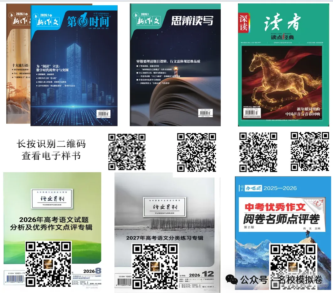 订新作文:《第一时间》《思辩读写》一年,送语文月刊:2026年第8、12期。