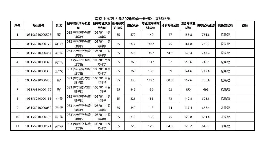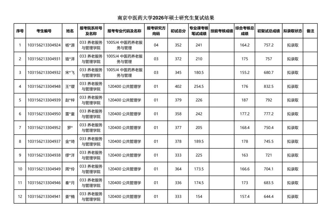 >南京中医药大学2026年养老服务与管理学院硕士研究生一志愿拟录取名单