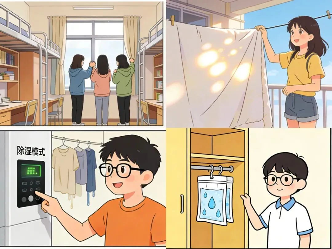巧用空调除湿。宿舍空调基本都有除湿模式,开一两个小时,明显感觉干爽。注意:除湿模式比制冷模式省电,放心用。