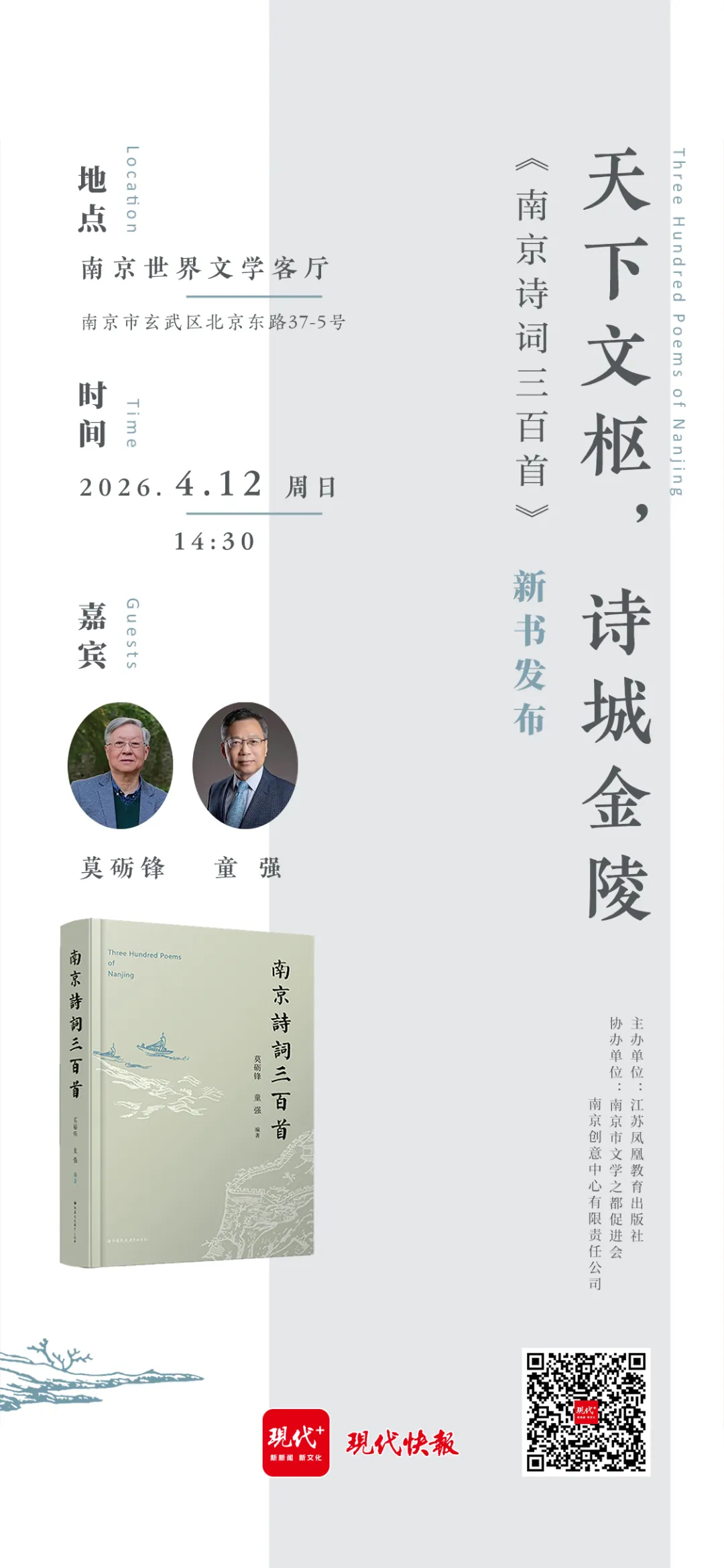 4月12日(周日)下午,《江苏文库》编纂出版委员会副主编、南京大学人文社科资深教授莫砺锋与南京大学教授童强,将携新书《南京诗词三百首》,走进南京鸡笼山下的世界文学客厅,以“天下文枢,诗城金陵”为题,展开一场关于城市与诗词的深度对话。
