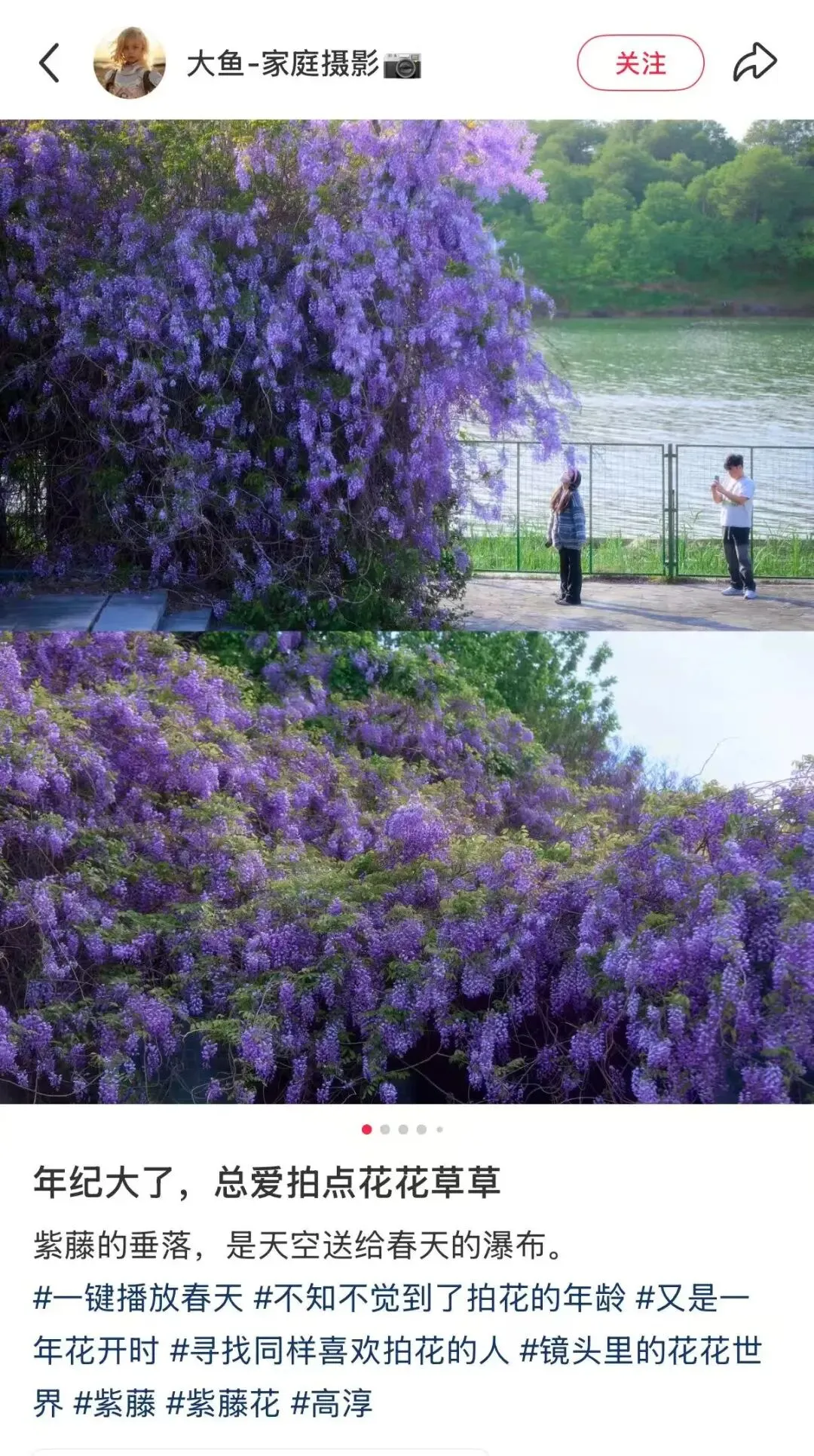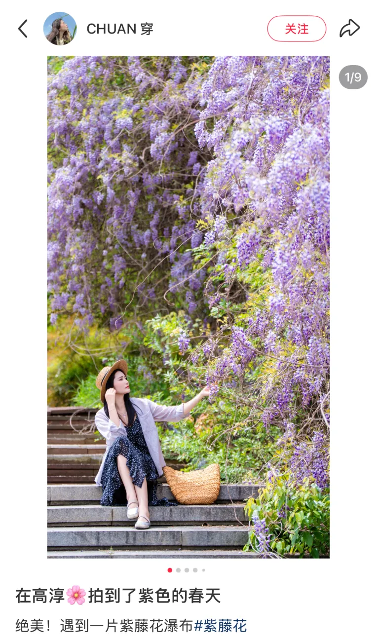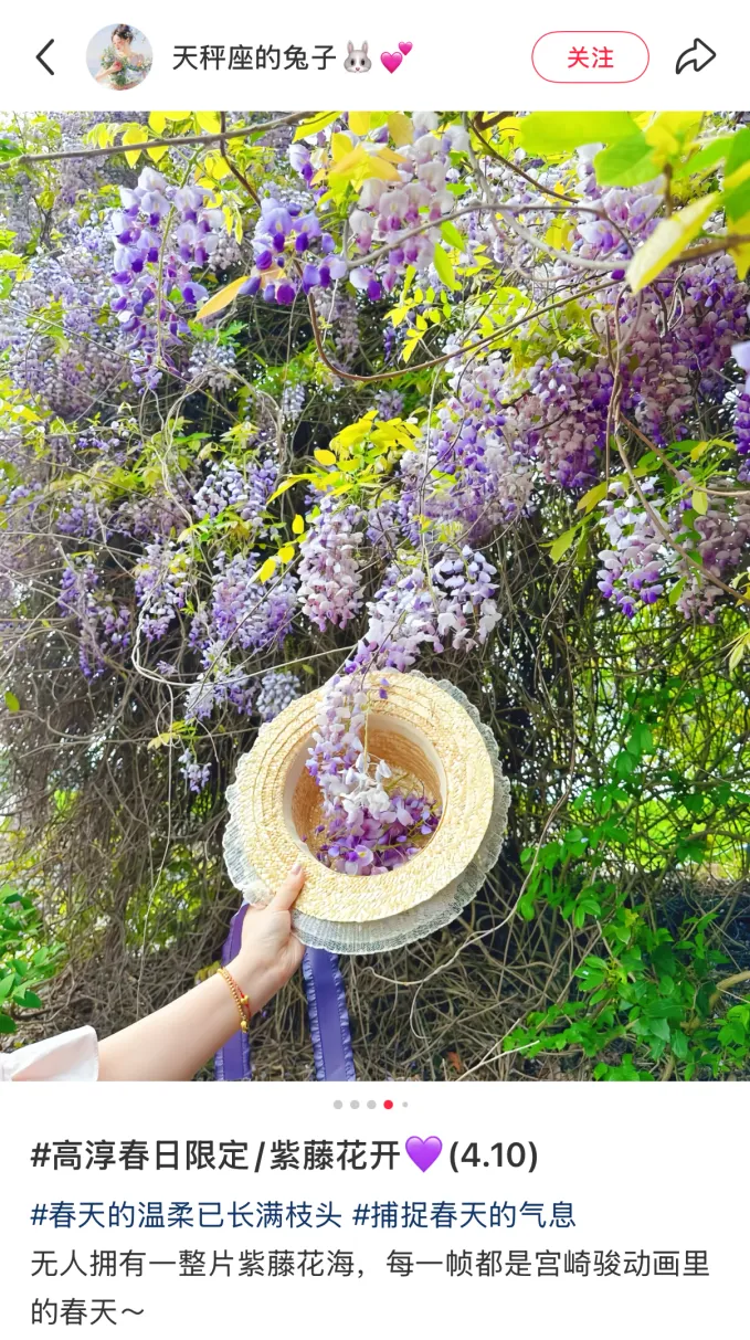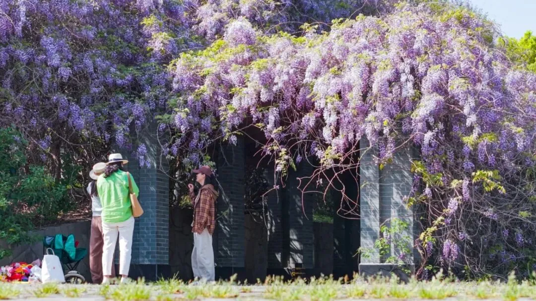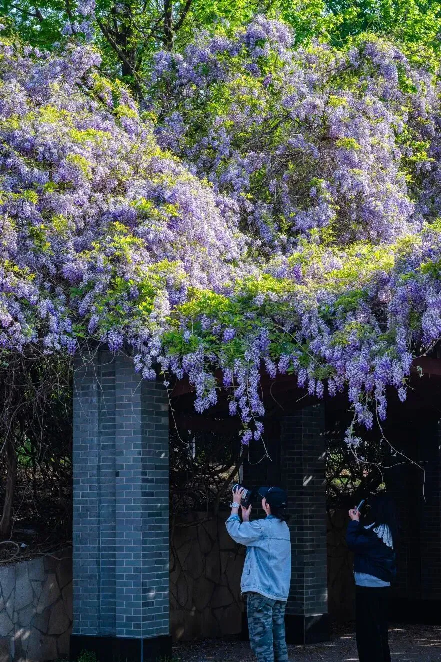 紫藤的盛花期很短,从花开到花谢大约只有半个多月的时间,眼下正值最佳观赏期,随手一拍都是春日壁纸。尤其值得一提的是,这里的花枝较矮,无需长焦或踮脚,轻轻松松就能拍出人花同框的氛围感照片。
