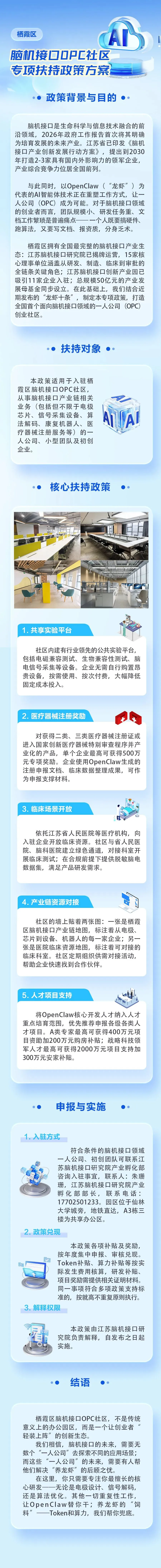 在栖霞区普适政策基础上,脑机接口额外叠加专项政策——栖智·元力BCI·OPC社区为创业者提供了诚意满满的专项扶持政策,以实打实的资源与支持,为脑机创新创业全程保驾护航。