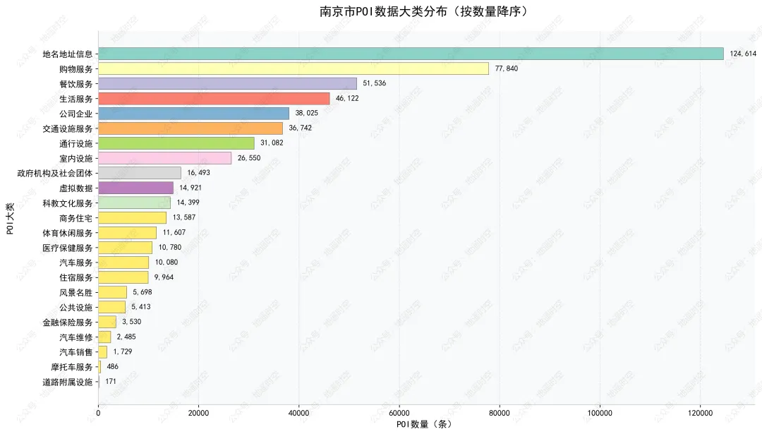本次统计覆盖南京全域23个POI大类,涵盖民生服务、商业消费、公共设施、交通出行、文旅休闲等全场景,从社区便民网点到科创园区,从历史文旅地标到现代交通枢纽,全方位呈现这座“古今交融”城市的空间分布逻辑。