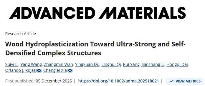 其比弯曲强度(386 MPa・cm³/g)优于钢、铝合金等传统材料,还具备优异的各向同性、热稳定性(200℃以下)和环境可持续性(碳足迹仅为铝合金的 17.4%),可应用于弹簧、轻质结构件等场景,为复杂承重结构提供了环保替代方案。相关研究以“Wood Hydroplasticization Toward Ultra-Strong and Self-Densified Complex Structures”为题,发表在《Advanced Materials》(IF 26.8)上。
