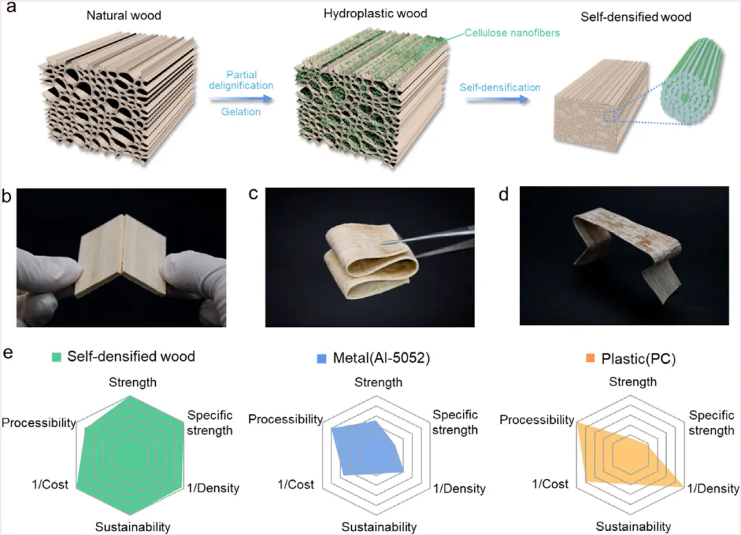 图1. 木材水塑化及自密实化为强韧可定制形状结构示意图。 a) 无需机械压缩的木材自密实过程示意图。b-d) 照片展示:(b) 天然木材在弯曲载荷下发生脆性断裂,(c) 柔软易折叠的水塑态木材,以及 (d) 加工成预设形状的自密实木材。e) 自密实木材、金属铝合金和塑料聚碳酸酯的性能对比雷达图,各项指标结果已按各自最大值归一化。