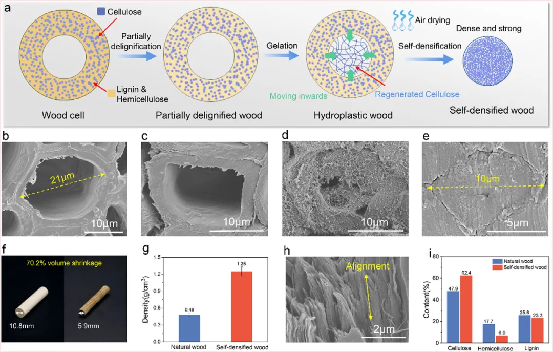 图2. 自密实木材的微观结构演变。 a) 通过温和脱木素、凝胶化和空气干燥形成自密实木材的示意图。木材细胞从中空的管腔均匀收缩为致密的圆柱状结构。b-e) 木材细胞横截面变化的扫描电镜图像:(b) 原始木材,(c) 部分脱木素木材,(d) 水塑态木材,以及 (e) 自密实木材。f) 原始木材和自密实木材的实物照片,显示均匀且大幅的体积收缩。g) 天然木材与自密实木材的密度对比。h) 自密实木材中纤维素纤维的扫描电镜图像,显示高度定向的纤维排列。i) 天然木材与自密实木材的化学成分,表明大部分木质素和半纤维素得以保留。