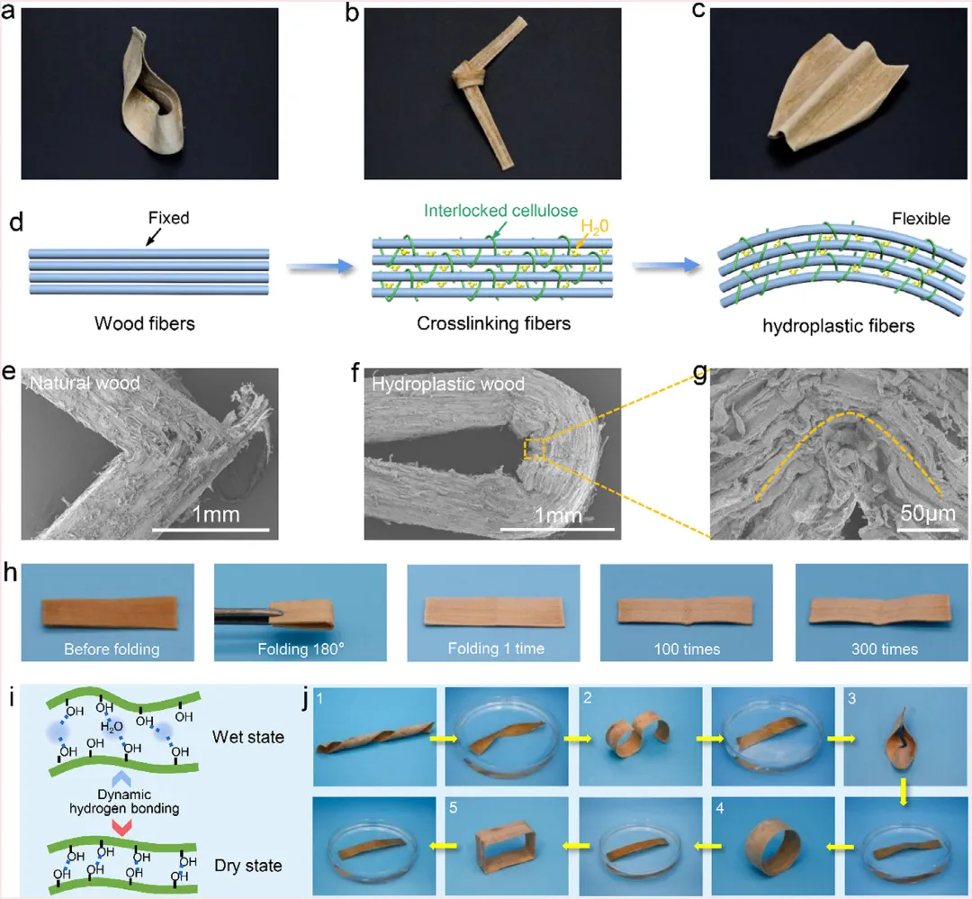 图4. 利用水塑化和微观结构调控将自密实木材制造成各种复杂形状。 a-c) 具有 (a) 弯曲、(b) 打结和 (c) 其他复杂形状的自密实木材照片。d) 木材塑形涉及的机制示意图。e-g) (e) 天然木材和 (f,g) 水塑态木材折叠处的扫描电镜图像。h) 水塑态木材样品的耐折叠性测试。i) 用于木材重塑的动态氢键作用示意图。j) 木材通过反复“水塑形”获得所需形状的演示,展示了优异的水塑性、可回收性和可重复使用性。