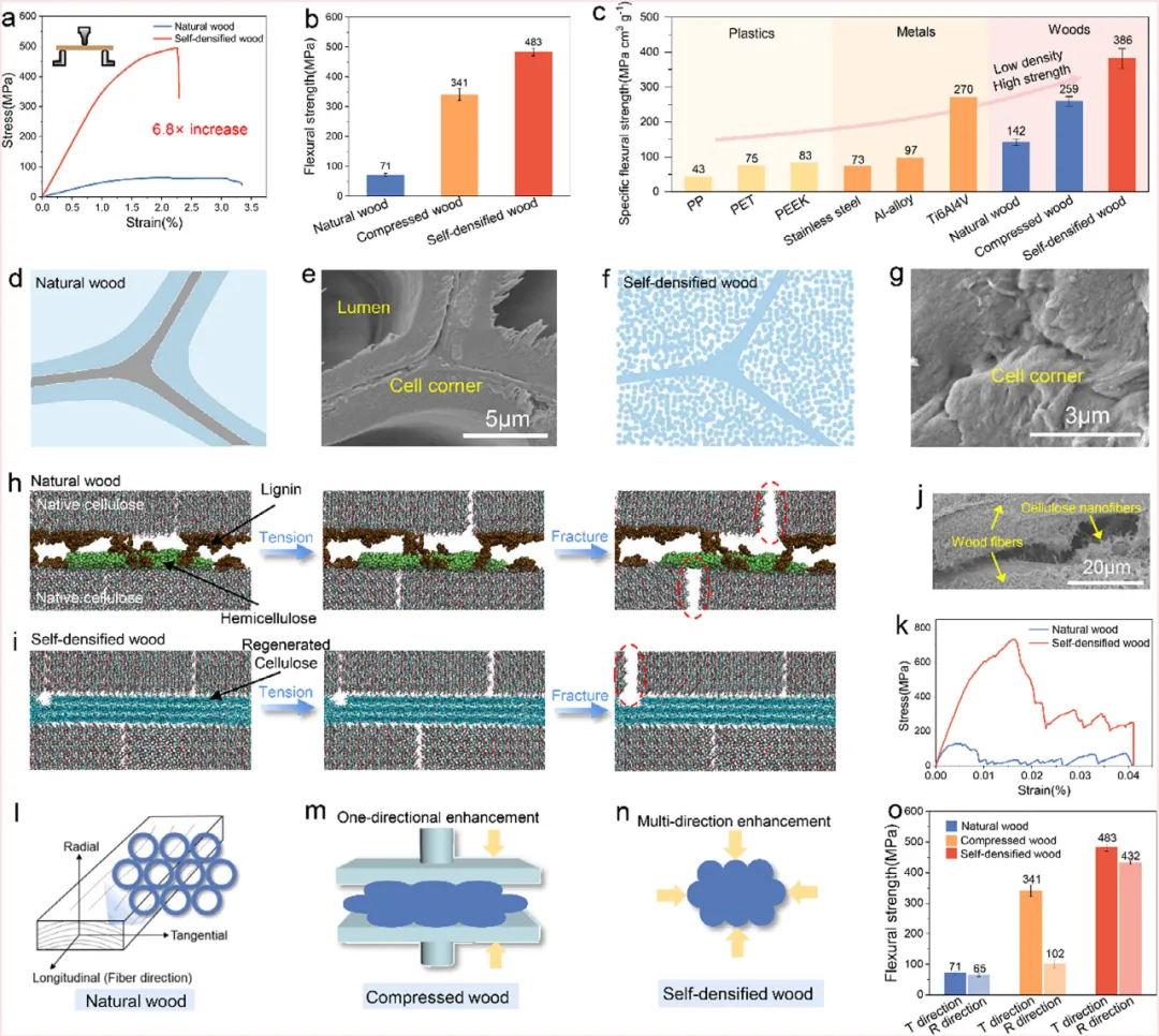 图3. 自密实木材的力学性能及强化机制。 a) 天然木材与自密实木材的弯曲应力-应变曲线。b) 自密实木材与天然木材、机械压缩木材的弯曲强度对比。c) 自密实木材与塑料、金属及其他木质材料的比弯曲强度对比。d-g) 天然木材与自密实木材微观结构中细胞间层角落的示意图及对应扫描电镜图像。h,i) 分子动力学模拟研究强化机制:(h) 由木质素和半纤维素交联的天然木材,以及 (i) 由再生纤维素交联的自密实木材在不同变形阶段的状态。所选变形状态对应材料的初始阶段、屈服阶段和最终断裂点。j) 自密实木材的扫描电镜图像,显示木纤维与作为粘合剂的再生纤维素纳米纤维之间紧密的界面结合。k) 通过分子动力学模拟评估的天然木材与自密实木材的拉伸应力-应变曲线。l-n) (l) 天然木材、(m) 机械压缩木材和 (n) 自密实木材样品的微观结构示意图。o) 天然木材、机械压缩木材和自密实木材在径向和切向的弯曲强度。
