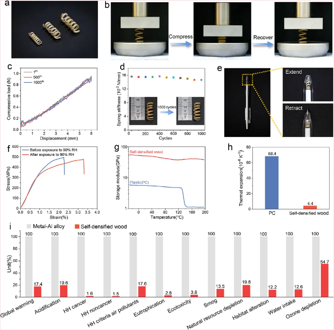 图5. 自密实木材弹簧的力学性能及环境影响。 a) 不同尺寸木材弹簧的照片。b) 木材弹簧循环压缩测试照片。c) 木材弹簧在特定循环次数(第1次、第500次、第1000次)下的典型压缩载荷-位移曲线,显示出优异的弹性和回弹性。d) 木材弹簧刚度随循环次数的变化。e) 自密实木材作为笔用弹簧的潜在应用照片。f) 聚氨酯表面涂层处理的自密实木材在暴露于90%相对湿度前后的弯曲应力-应变曲线。g) 自密实木材与聚碳酸酯塑料在-30至200°C范围内储能模量的对比。h) 自密实木材与聚碳酸酯的热膨胀系数对比。i) 自密实木材与铝合金的环境影响对比,各环境影响类别已按最大值归一化。