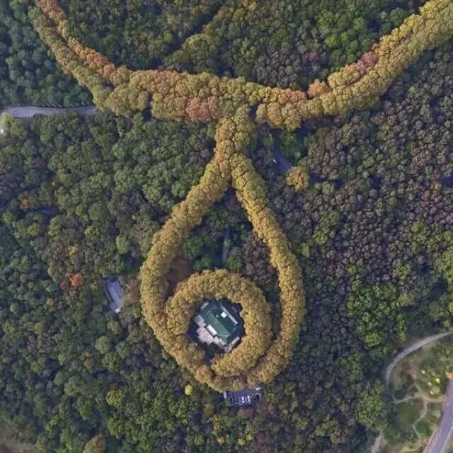 航拍视角下,梧桐树环绕成一条巨大的”项链”,美龄宫就是那颗蓝宝石坠子。