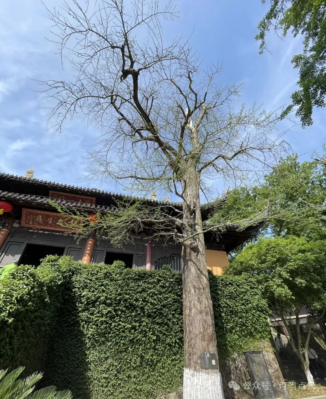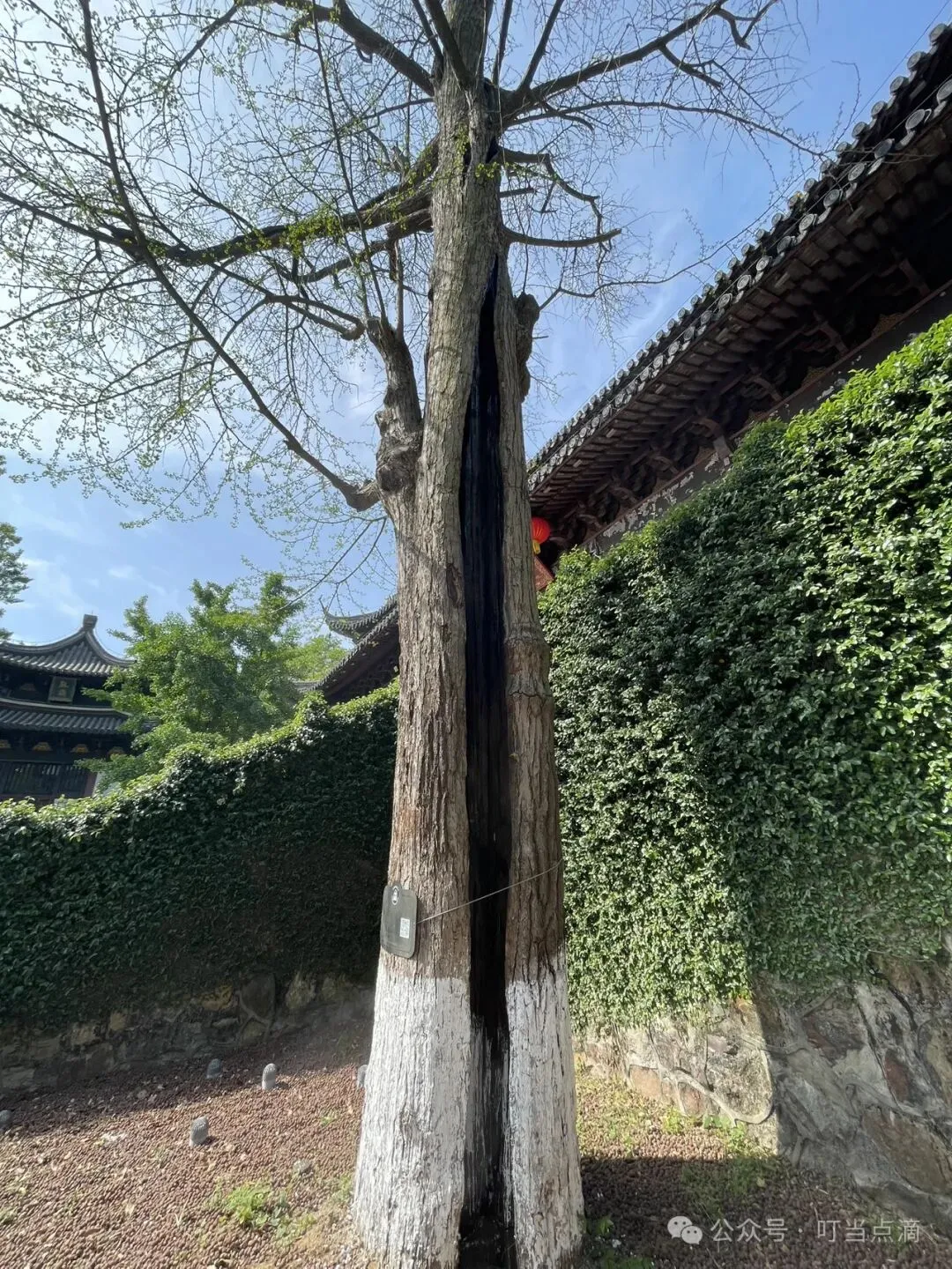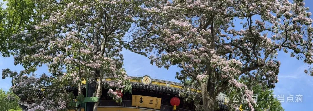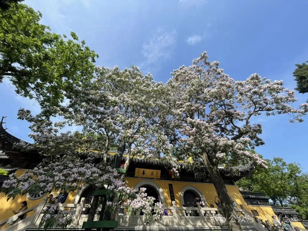 这座始建于南朝的千年古刹,因寺前两株古老的楸树而名动江南。今日恰逢花期鼎盛,花影与梵音交织,成全了一场诗意与禅意的邂逅。 未至山门,目光已被两团粉紫色的云霞攫住——那正是被誉为“江南第一楸”的古树。两树并肩而立,高者近20米,枝干虬劲如苍龙,低者稍敛锋芒,却以繁花织就垂天的锦绣。楸花形似小铃铛,淡紫色花瓣薄如蝉翼,簇成穗状缀满枝头,远望如“团团缀玉,点点攒星”,近观则见花蕊间蜂蝶翩跹,细嗅有清冷幽香沁入心脾。楸花盛开大约十日左右,一场雨后便会“满地紫花铺禅径”,当年老苏感慨“落英满地君方见,惆怅春光又一年”。好在现时即使远隔千里也可随时感知花开花谢,奔赴一场芳华之约。 转过刻有弘一大师手书“大愿成满,百福庄严”的照壁,进入禅寺。正中天王殿悬“最上一门”旧匾,左右钟鼓楼飞檐翘角,檐下铜铃随风轻响,与楸树梢头的鸟鸣遥相呼应。