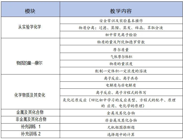 暑期集训队化学课程遵循两个宗旨:第一 ,衔接初高中知识点;第二,培养高中化学思维方式。现行的高一课本(必修一和必修二)内容是以小高考为蓝本编撰,也是高二、高三选修化学的重要基础。同时着眼适应高考改革,集训队化学课的课程安排就按照高考难度要求规划。